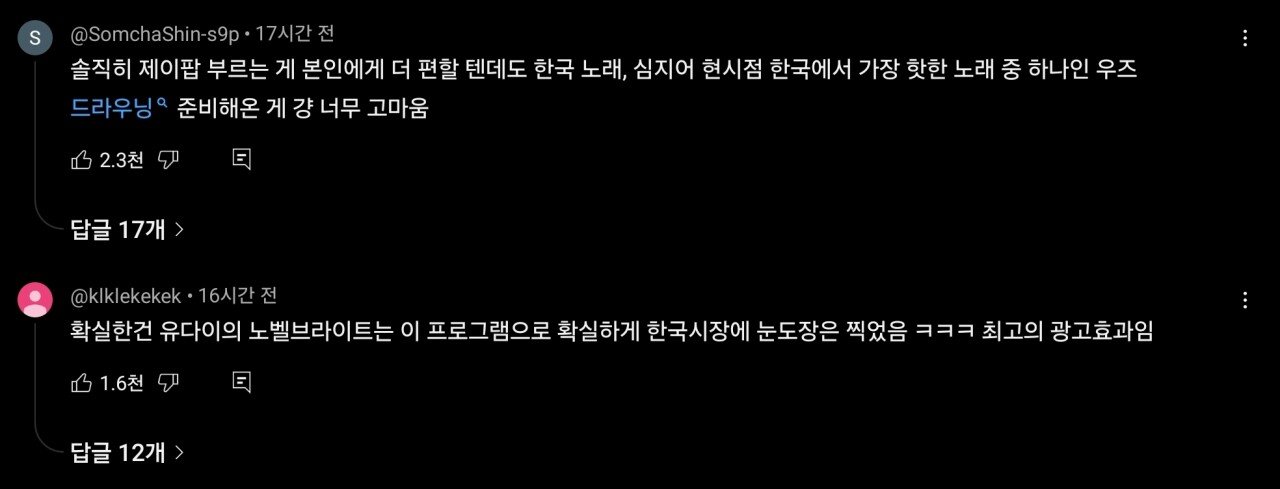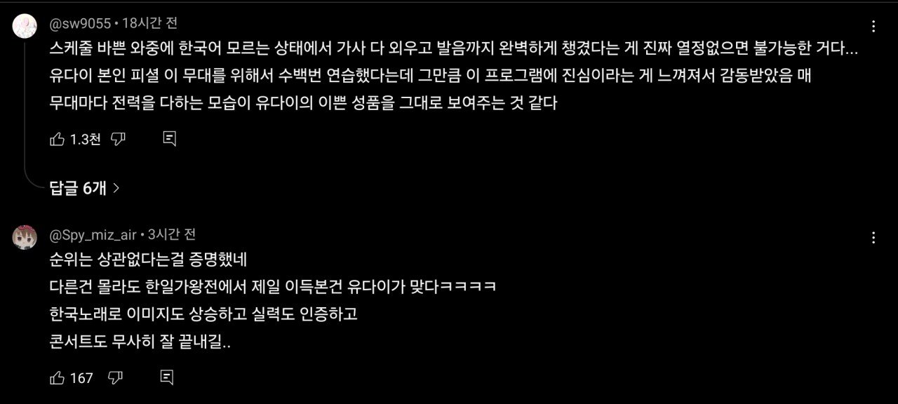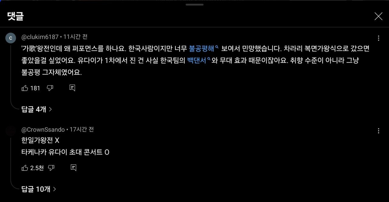 현재 편파적인 판정으로 논란이라는 프로그램 댓글 0 조회 594 10.02 08:29 작성자 : 드가쥬아 좋아요 팔로우 게시글 보기 한일 가왕전이라는 한국vs일본 가수들끼리 노래 대결을 하는 프로그램인데 유다이라는 일본 가수가 한국 가수들 보다 압도적으로 잘했는데도 불구하고 판정단 점수가 낮게 나와서 과도한 국뽕으로 편파판정이 아니냐고 논란중이다. 일본가수는 일본의 노벨브라이트라는 메이저급 밴드의 보컬이라고 한다. 바쁜 스케줄와중에 한국어 가사를 외워서 불렀다고 함. 드가쥬아님의 최신 글 10.03 채수빈 데뷔하기 전 일반인 시절 모습 10.03 이 얼굴에 몸매까지 죽여주는 설윤 10.02 스타일 파격변신한 예지 근황 10.02 묘한 분위기의 김태리 초딩 사진 10.02 백지헌 가까이서 실제로 보는 느낌 10.02 배우 탕웨이 쌩얼수준 실화냐 10.02 어제자 경성대 축제... 지원 직캠 ㅗㅜㅑ 10.02 어느 정육업자가 고기 핏물을 제거하지 않는 이유 10.02 마선호한테 개발려버린 김종국 10.02 메이크업 받는 폭싹 학씨부인, 마녀 김다미 엄마