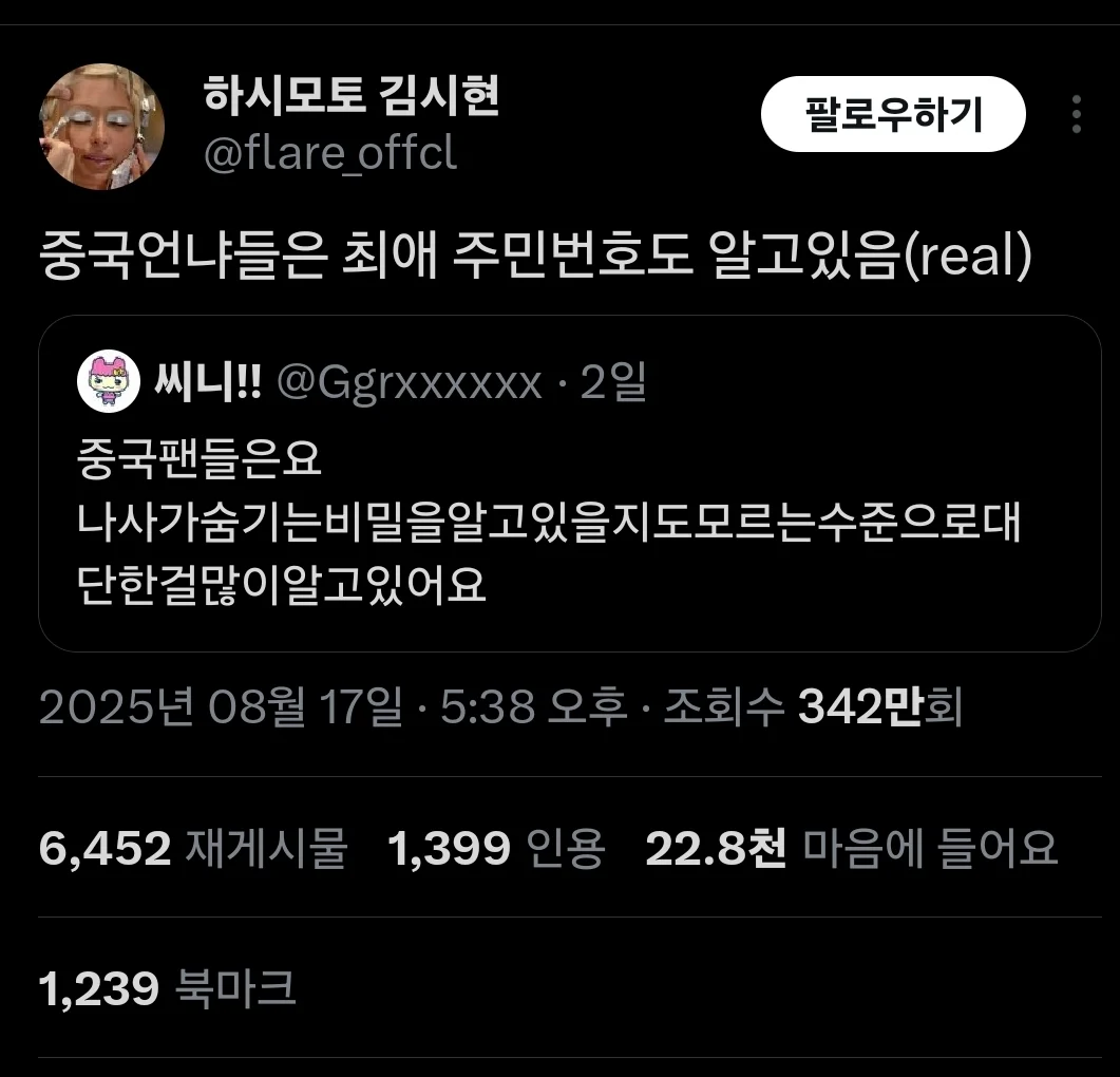 중국 아이돌 팬 특징 댓글 0 조회 596 10.02 16:25 작성자 : 돌잔치앤가반나 좋아요 팔로우 게시글 보기 자기가 팬하는 아이돌 주민등록번호도 암 돌잔치앤가반나님의 최신 글 10.03 채수빈 데뷔하기 전 일반인 시절 모습 10.03 이 얼굴에 몸매까지 죽여주는 설윤 10.02 스타일 파격변신한 예지 근황 10.02 묘한 분위기의 김태리 초딩 사진 10.02 백지헌 가까이서 실제로 보는 느낌 10.02 배우 탕웨이 쌩얼수준 실화냐 10.02 어제자 경성대 축제... 지원 직캠 ㅗㅜㅑ 10.02 어느 정육업자가 고기 핏물을 제거하지 않는 이유 10.02 마선호한테 개발려버린 김종국 10.02 메이크업 받는 폭싹 학씨부인, 마녀 김다미 엄마