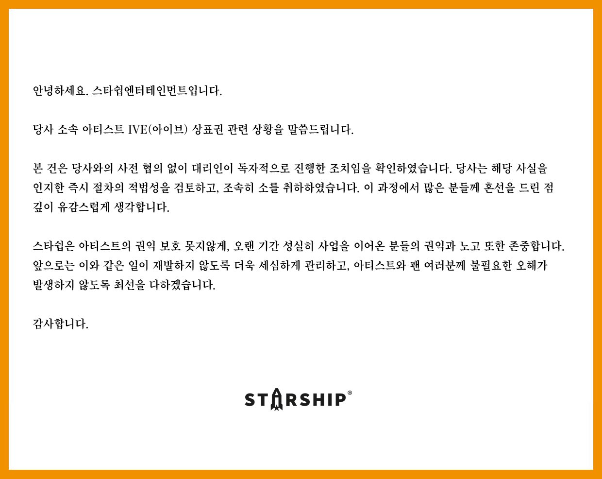 소속 아티스트 아이브 상표권 관련 상황 안내 스타쉽 공지
