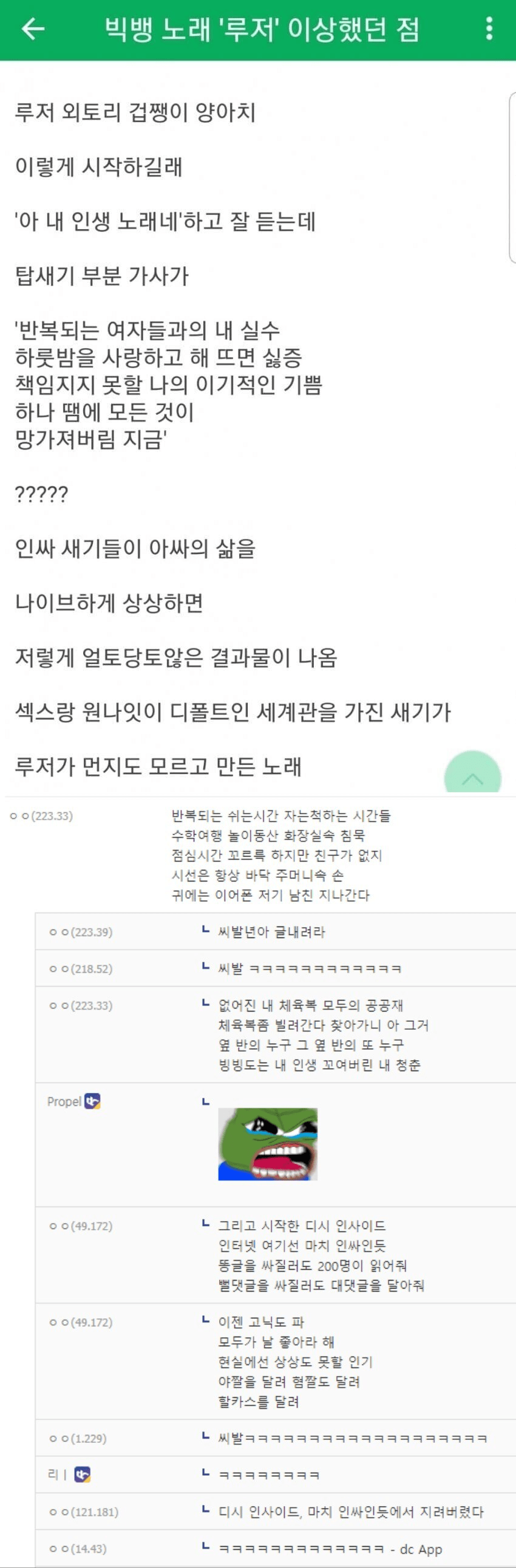 빅뱅 노래 "루저"가 이상하다는 디씨인 댓글 0 조회 520 10.10 08:48 작성자 : 가비슈포댄서 좋아요 팔로우 게시글 보기 가비슈포댄서님의 최신 글 10.10 권정열 옆에선 주우재의 매너다리 10.10 훠궈집 사장님에게 사랑 고백하는 문샤넬 10.10 다이어트가 최고의 성형이란걸 보여주는 리즈 10.10 팔다리 길쭉길쭉하게 폭풍성장한 추사랑 10.10 월급 1억 받는 사람이 내는 세금 10.10 홍석천이 국내 최초로 도입한거 10.10 불륜 싸이트 역대급 기울어진 운동장 10.10 이시바 총리 “아시아 국가들이 일본을 참아준거다” 10.10 어제 KBO 논란의 시구 장면 10.10 이장우에게서 백종원이 보인다