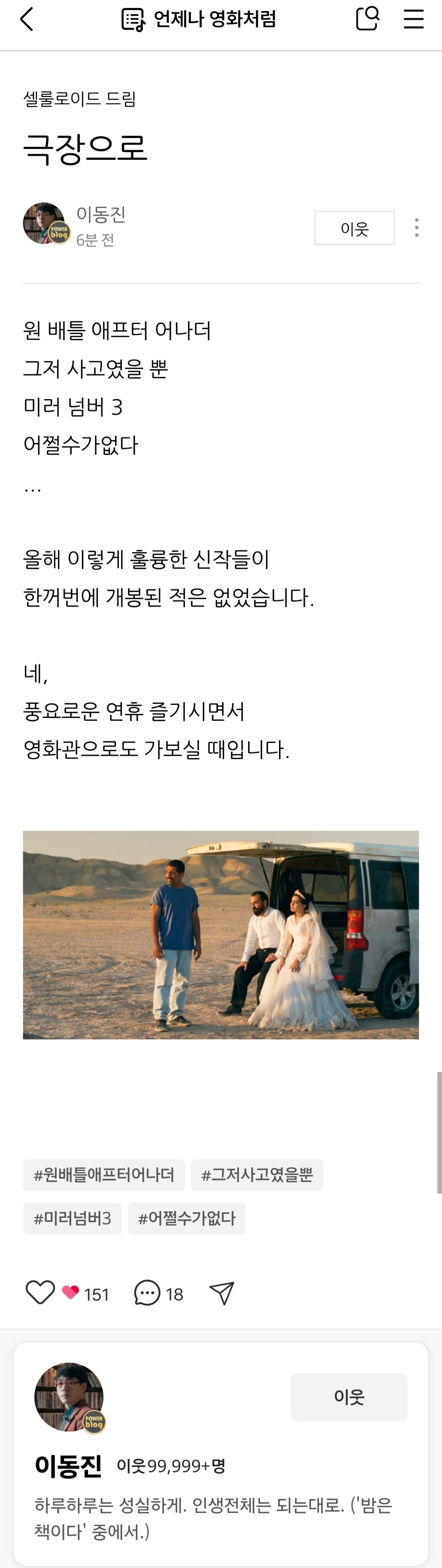 이동진 "이렇게 훌륭한 신작들이 한꺼번에 개봉된 적 없다" 댓글 0 조회 558 4시간전 작성자 : 공룡 좋아요 팔로우 게시글 보기 원 배틀 애프터 어나더, PTA 폴 토마스 앤더슨 그저 사고였을 뿐, 자파르 파나히 미러 넘버 3, 크리스티안 페촐트 어쩔수가없다, 박찬욱 공룡님의 최신 글 10.03 넷플릭스 김은숙 신작 드라마 공개 10.03 브래드 피트가 받았던 2억원짜리 성형수술 10.03 사극에서 사약 제조법 10.03 QWER 응원봉 실물 사진 10.03 성수기 개봉 한국영화 다 망했던 시즌 10.03 맥가이버 형님 근황 10.03 진짜 예쁜 여주 나오는 영화 10.03 케데헌 골든 빌보드 1위 놓아줘야 할 시간 10.03 넷플릭스가 지브리를 갖게된 이유 10.03 전성기 이소룡의 미친 인기 수준
