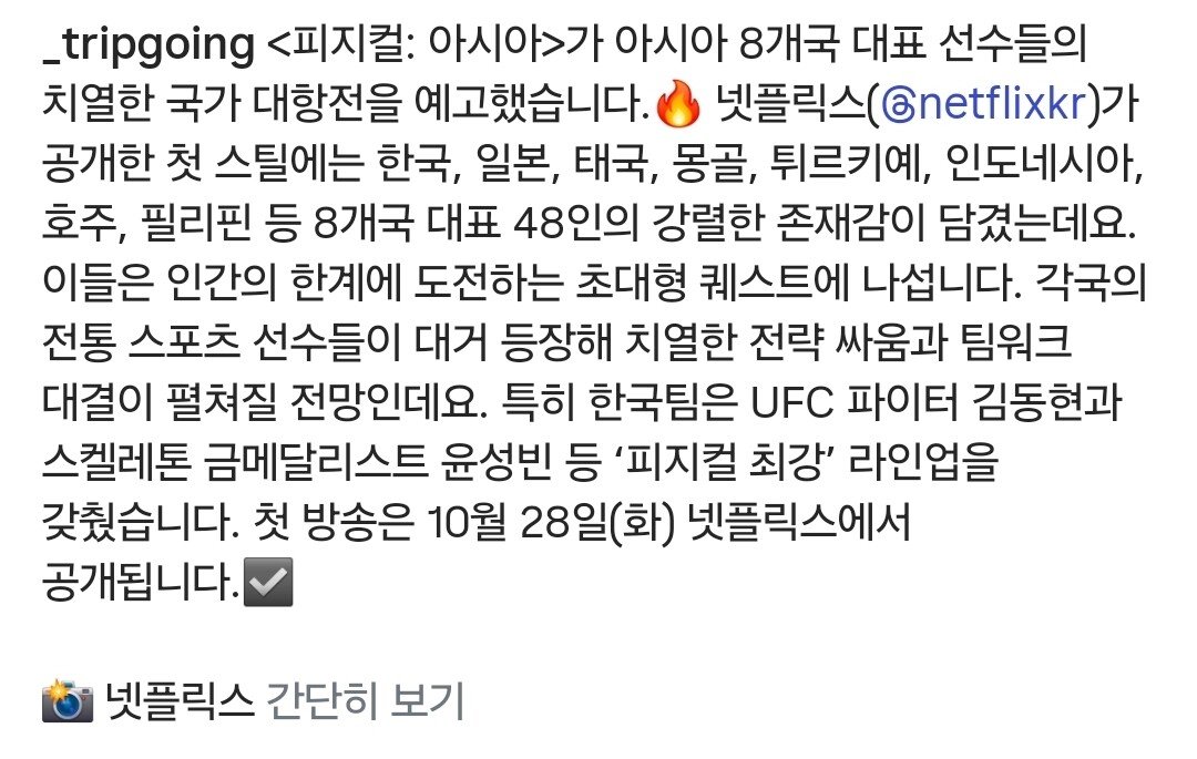 [넷플릭스, 피지컬: 아시아] 8개국 선수 스틸컷 공개 댓글 0 조회 550 10.10 18:48 작성자 : 개장수11 좋아요 팔로우 게시글 보기 파퀴아오 휘태커 김동현 개장수11님의 최신 글 10.10 홍석천이 국내 최초로 도입한거 10.10 불륜 싸이트 역대급 기울어진 운동장 10.10 이시바 총리 “아시아 국가들이 일본을 참아준거다” 10.10 어제 KBO 논란의 시구 장면 10.10 이장우에게서 백종원이 보인다 10.10 육사 3명 중 1명, 병사로 입대... 기갑 하사 22%만 임관 10.10 원피스) 이무의 오로성 업무 보고 타임라인 10.10 매니저 갑질 이찬혁과 친절한 윤도현 10.10 여성 전용 도서관 레전드 10.10 전진 부인 방송 나온 후 직장동료들 반응