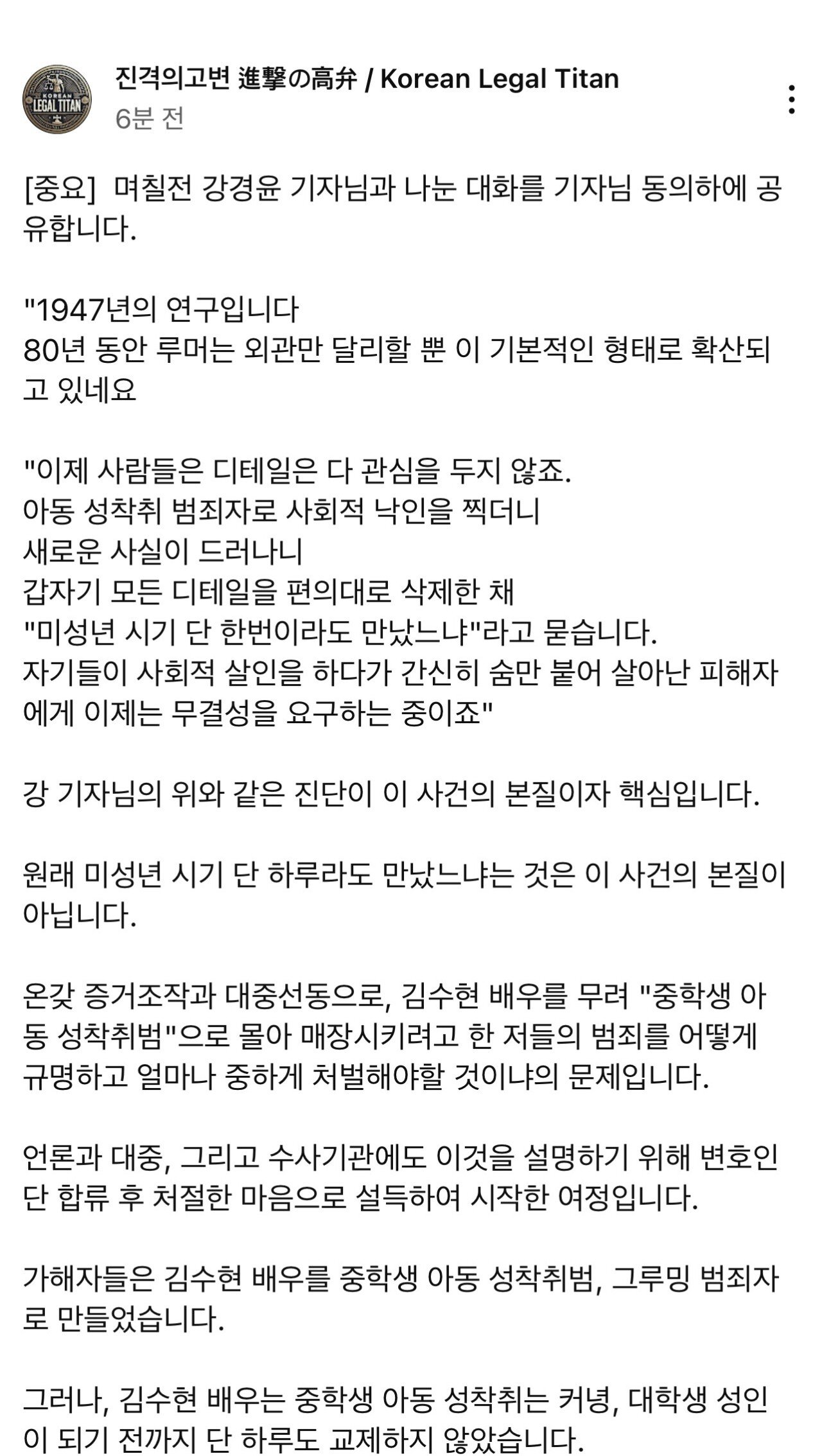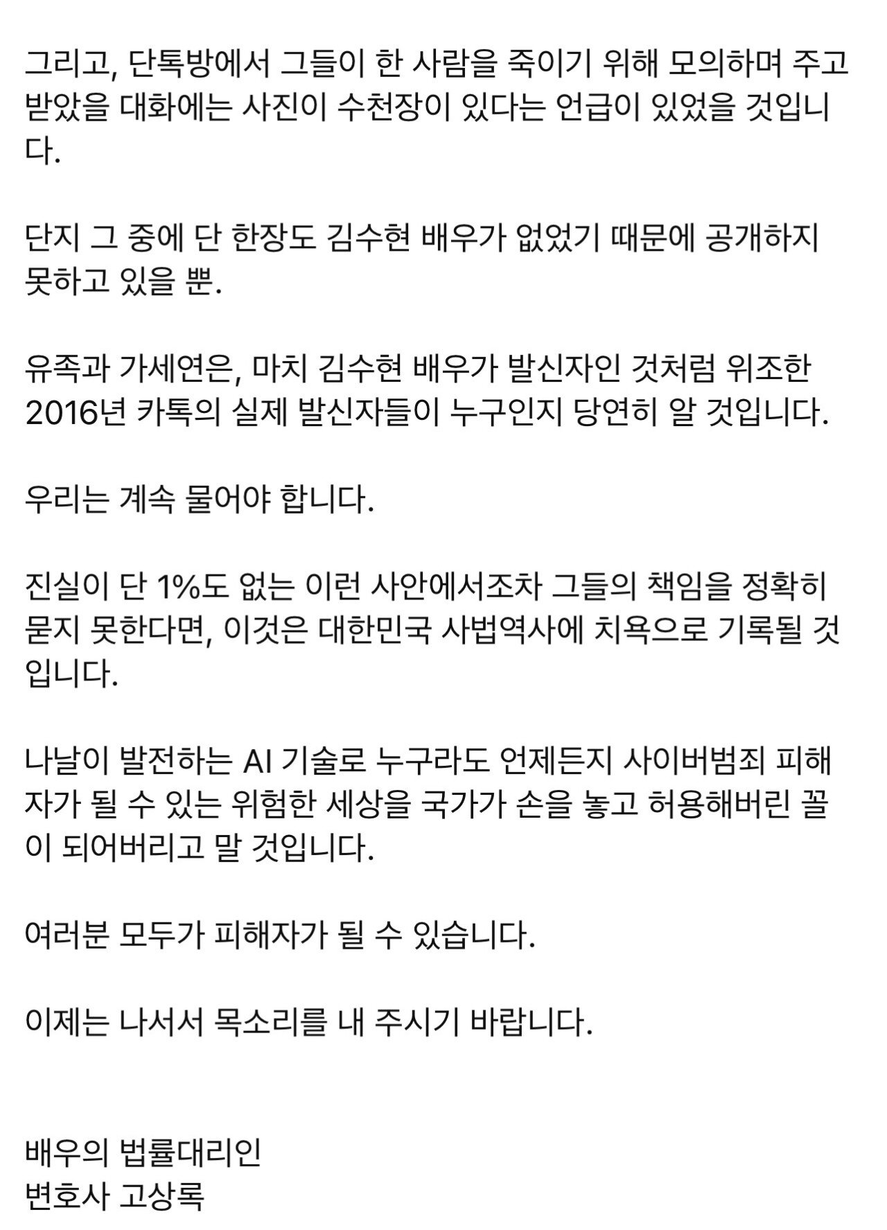 김수현 형사 전담 변호사가 월요일에 새로운 입장문 낸다고 예고함
