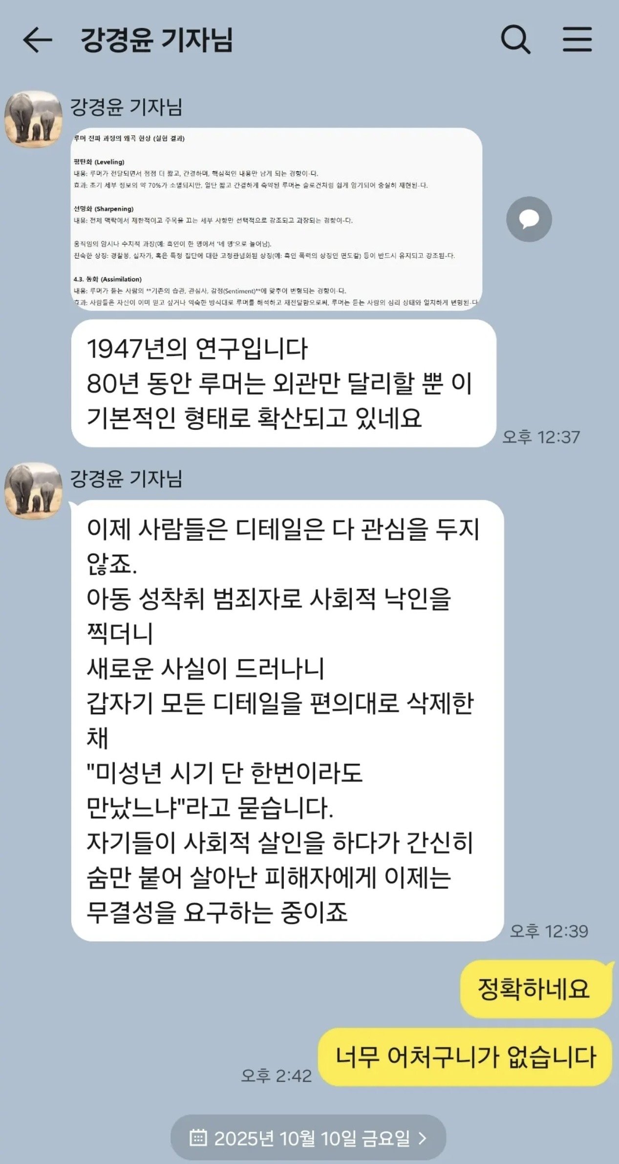 효과: 사람들은 자신이 이미 믿고 싶거나 익숙한 방식대로 루머를 해석하고 재전달함으로써, 루머는 듣는 사람의 심리 상태와 일치하게 변형된다.