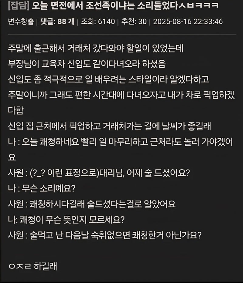 신입한테 조선족이냐는 소리 들은 대리 댓글 0 조회 563 5시간전 작성자 : 드가쥬아 좋아요 팔로우 게시글 보기 드가쥬아님의 최신 글 10.12 최홍만 니플패치 ㅋㅋ 10.12 박성웅이 진짜 무서웠던 안유진 10.12 한 때 유행했던 힙합 브랜드 10.12 충격적인 트와이스 신곡 음원 순위 10.12 귀멸의 칼날 논쟁거리 3가지 10.12 그것이 알고 싶다 다음주 예고 10.12 아이즈원 강혜원 새 드라마 스피릿핑거스 스틸컷 10.12 솔직히 정면은 우정잉이 비벼볼만함.. 10.12 여자 보컬 탑 클래스중 하나라고 생각하는 분 10.12 지상파 3사 현재까지 드라마 시청률 정리