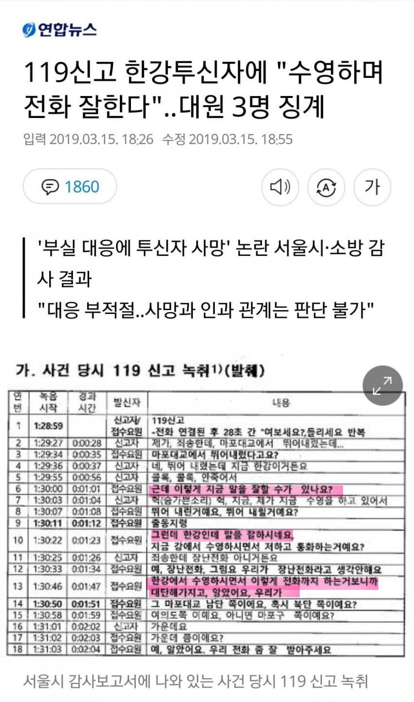 119신고 한강투신자에 "수영하며 전화 잘한다"…대원 3명 징계(종합) | 연합뉴스
