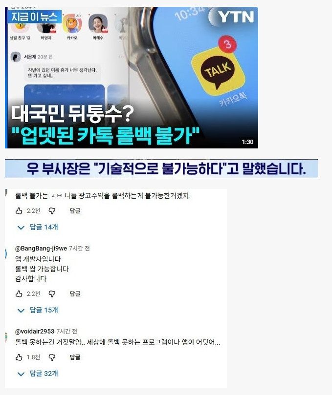 "카톡 업데이트 이전으로 못 되돌려" 롤백 불가 선언