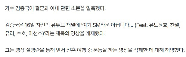 김종국 신혼여행 운동 유튜브 삭제 해명