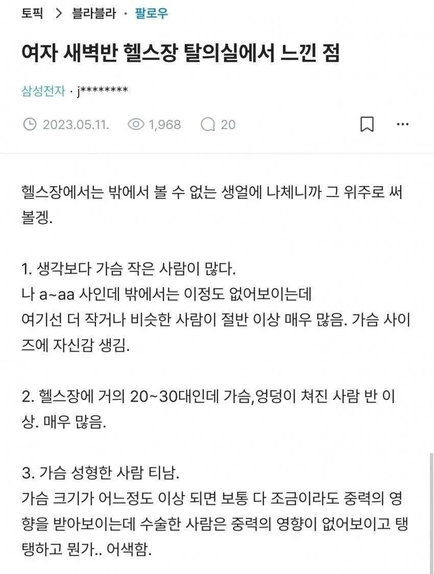 삼전 누나가 헬스장 탈의실에서 느낀점 댓글 0 조회 600 10.17 21:31 작성자 : 강승 좋아요 팔로우 게시글 보기 강승님의 최신 글 10.18 놀토 정답 다 뺏기는 원희 10.18 뉴스탄 전기차 충전소 캠핑 강아지 민폐녀 논란 반전 10.18 나혼산 시절 마늘통닭 먹방하는 데프콘 10.18 다음주 "첫 눈" 내린다 10.18 호주 이어 덴마크도 미성년 SNS 전면 금지 10.18 한국 "글로벌 군수 허브"로 도약할 기회 10.18 정부 지원 중단된 EBS 위대한 수업 근황 10.18 아침 식사 등급표 10.18 늙어보인다는 악플읽고 상처받은48세 박영규 와이프 10.18 방송이 사람 망치는 이유