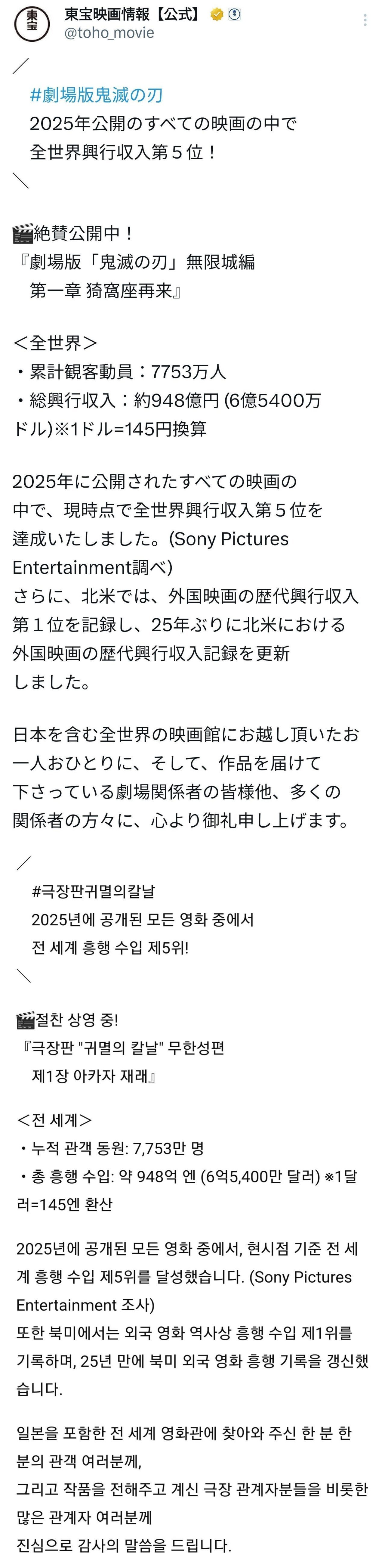 <귀멸의 칼날: 무한성편> 공식 글로벌 흥행 7753만명