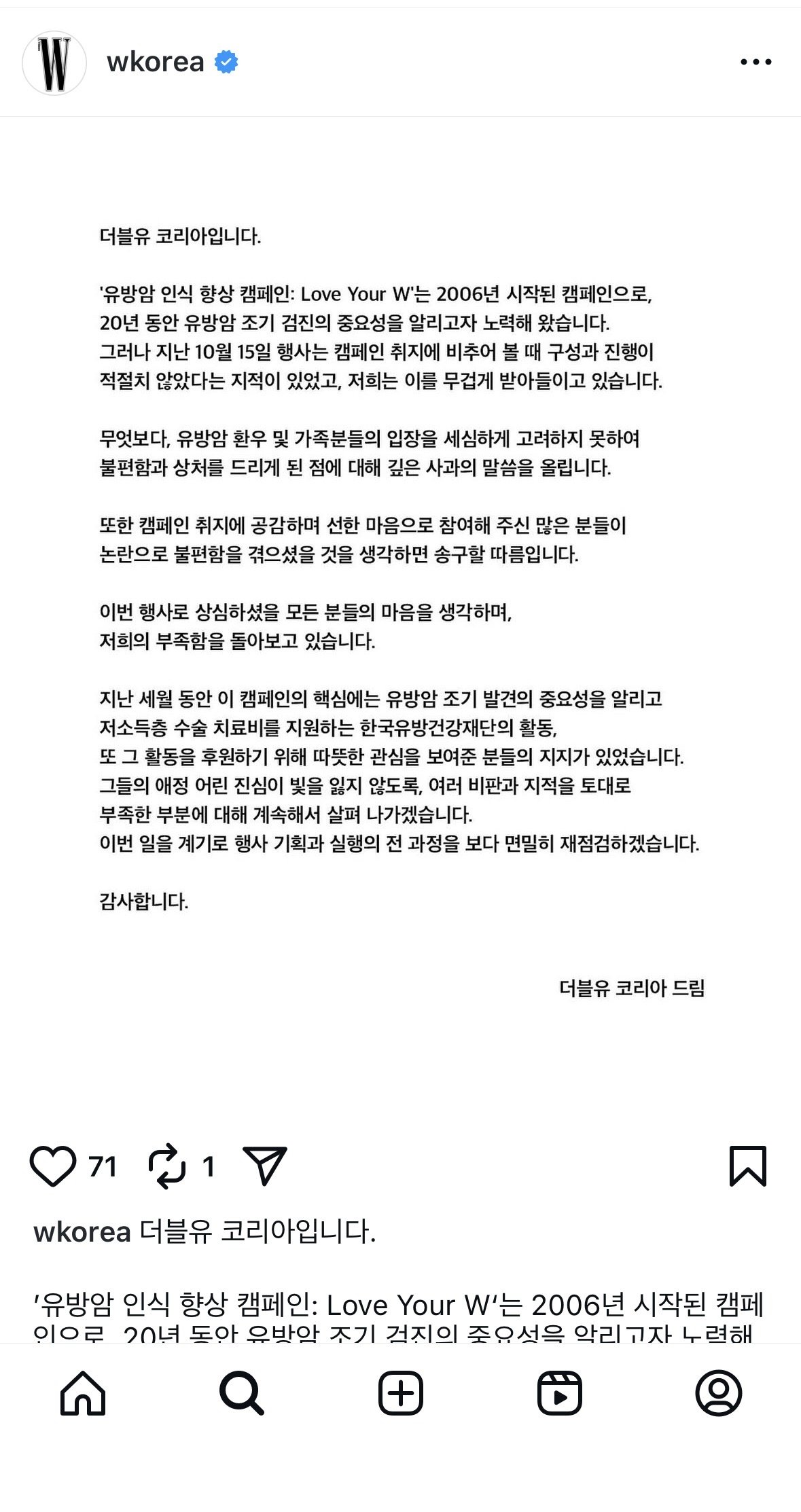 유방암 파티 논란으로 민심 나락간 W코리아 사과문 뜸