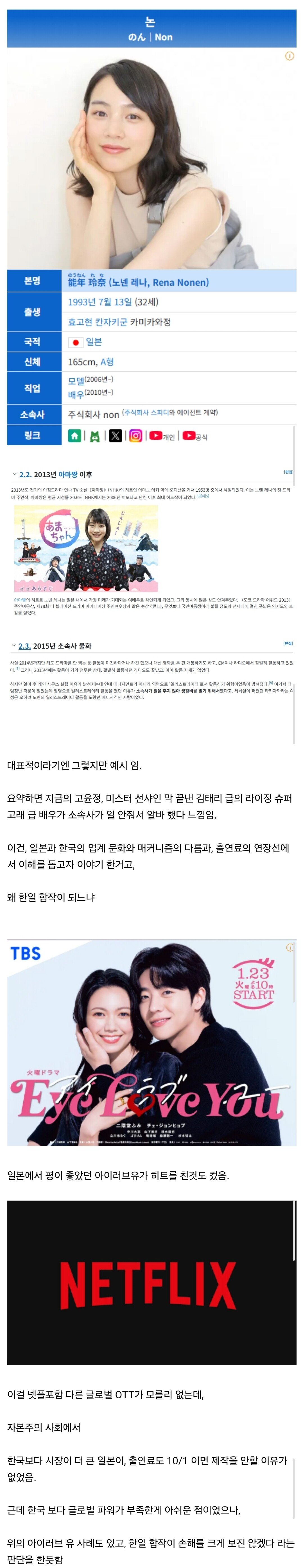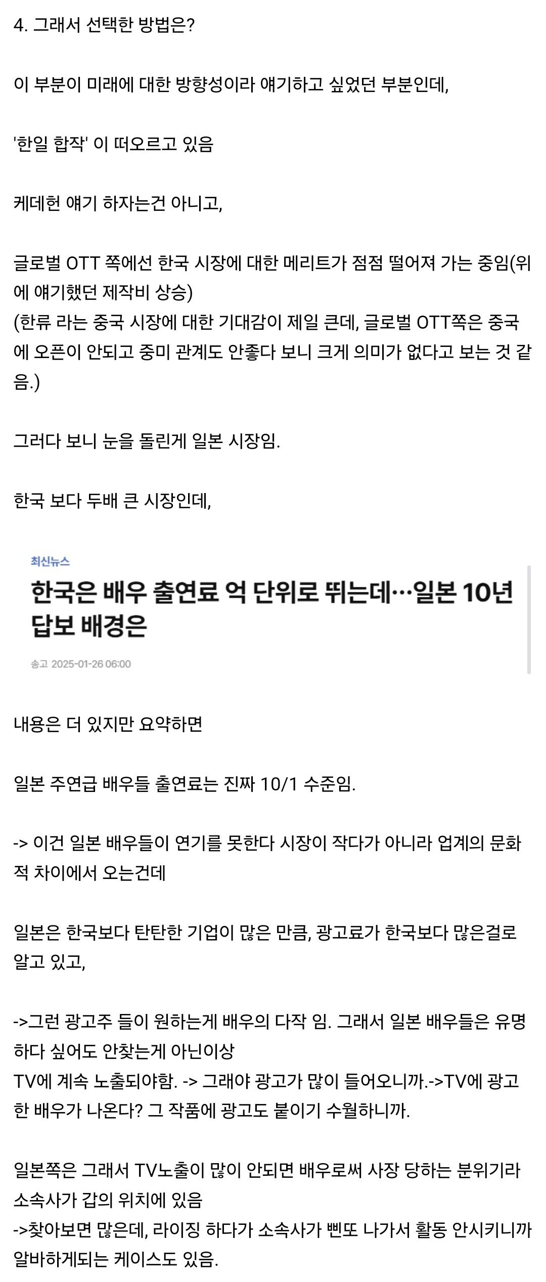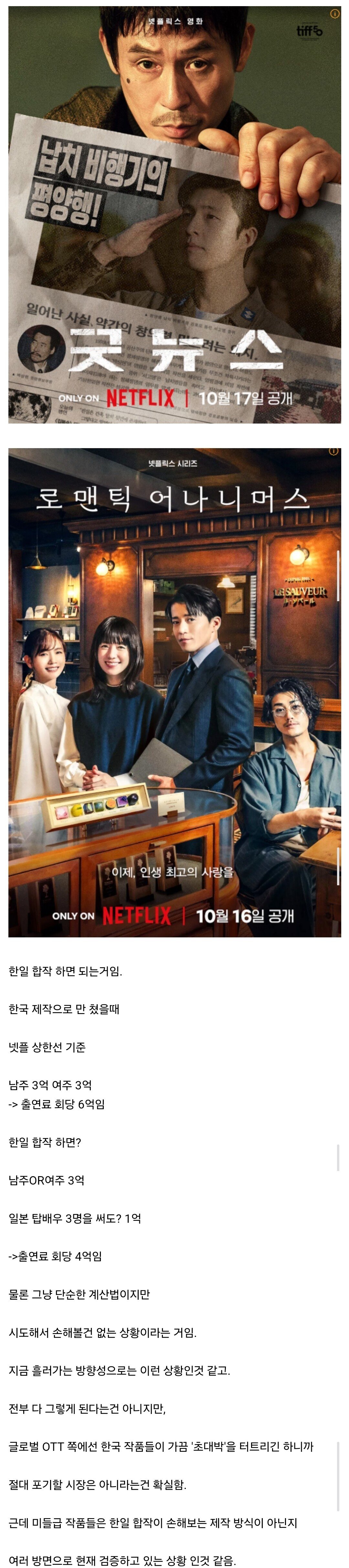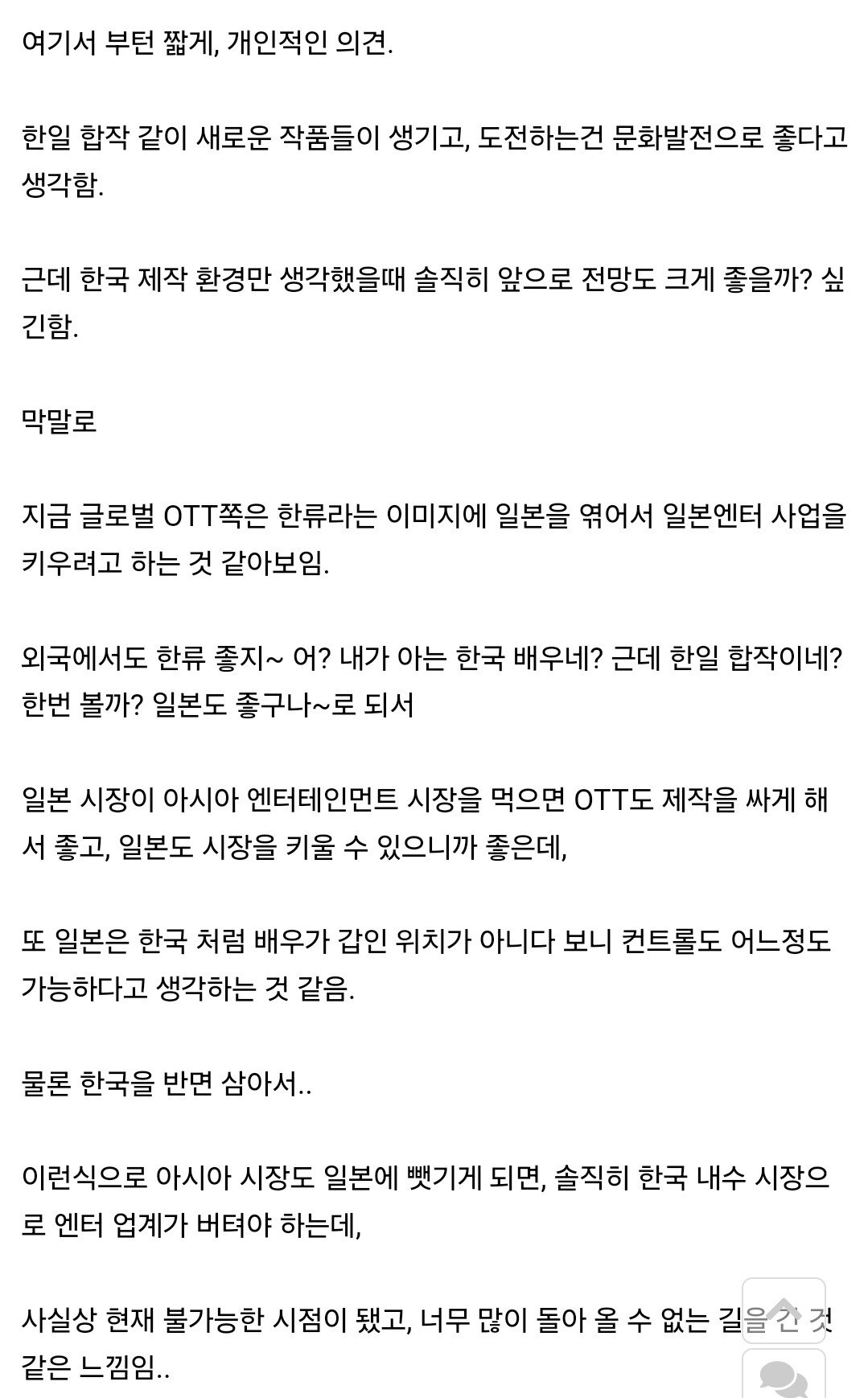 글로벌 OTT에서는 제작을 싸게 해서 좋고, 컨트롤도 어느정도 가능하다고 생각하니 한류라는 이미지에 일본 엔터사업을 키우는 움직임을 보이고 있어 한국 콘텐츠의 시장파이도 줄어들까봐 걱정중