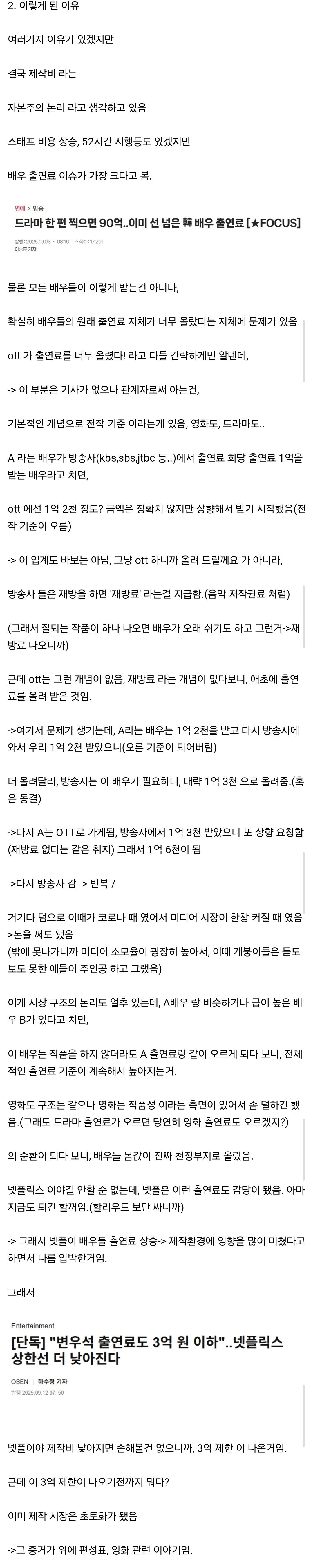 2. 드라마도 제작비 폭등과 편성 축소로 위기 국면에 진입, 특히 OTT의 등장과 성장으로 인한 배우 출연료 급등이 가장 큰 부담으로 작용하며 중간 규모의 작품 제작이 점점 어려워지고 있음.