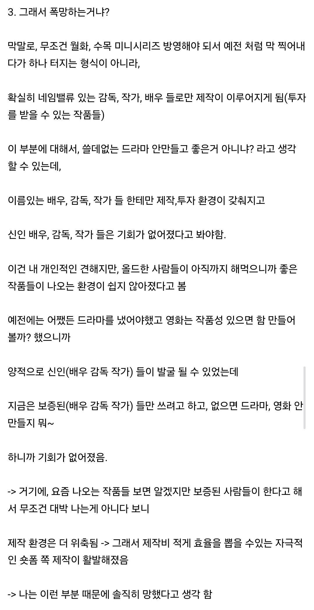 근데 그 베테랑들이 제작한다고 작품이 무조건 대박나는것도 아니라 제작 환경은 더욱 악화되니 제작비는 적으면서 효율을 뽑을수 있는 자극적인 숏폼 제작이 활발해지면서 산업의 다양성과 창의성이 점차 사라지고 있음