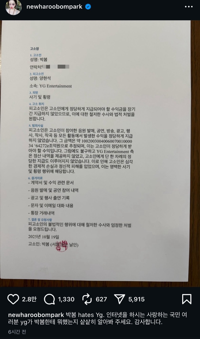 박봄이 YG엔터테인먼트(및 양현석)을 상대로 공개한 고소장에 적힌 금액은