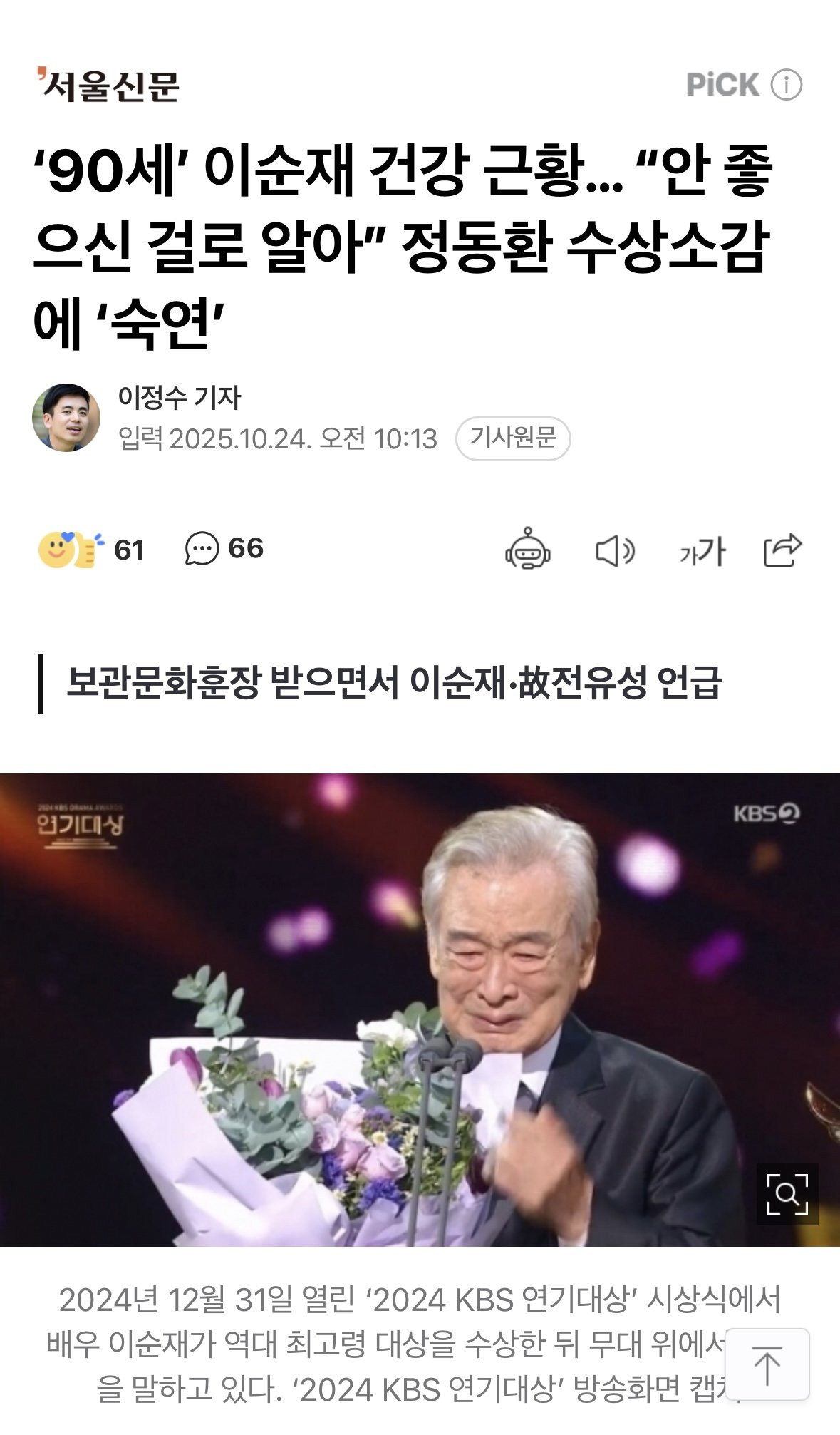 배우 이순재 건강 악화 근황