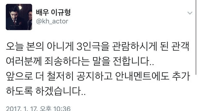게다가 공연이 끝나고 당사자 이규형 배우가 본인 트윗으로 앞으로 공지에 더 힘쓰고 안내멘트에도 추가하겠다고 하며