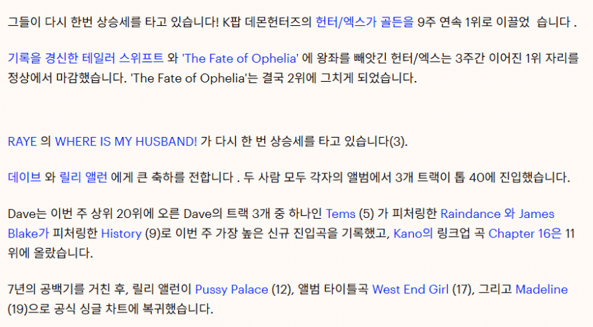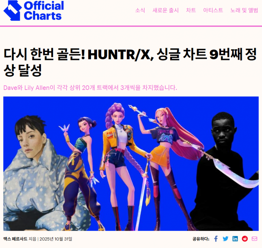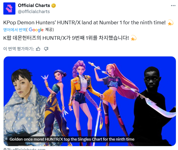 금요일(10월 31일), 케데헌의 ‘Golden’이 영국 싱글 차트 정상으로 복귀하면서