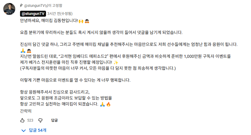 고마워서 보답으로 그만큼 팬들에게 이벤트 하겠다고 했는데 그 이후로 슈퍼챗 후원이 천만원 단위가 넘어가면서