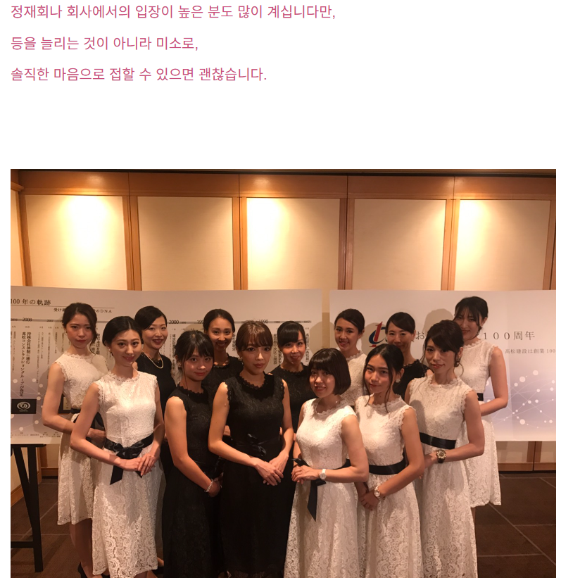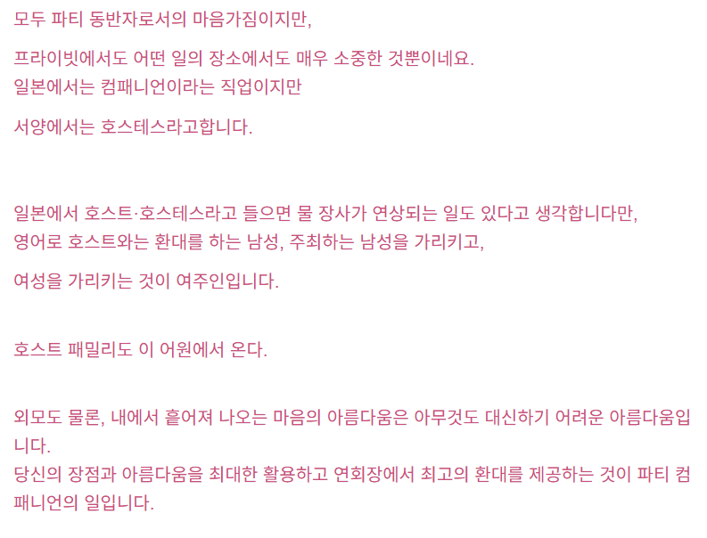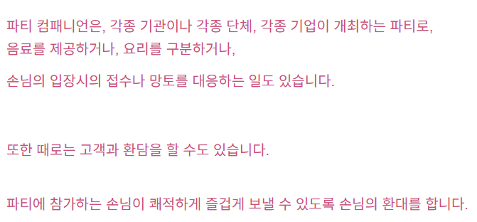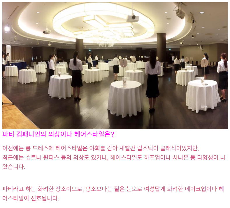 호텔 파티에서 긴 드레스를 입고 서 있다가 손님에게 음료를 건네주기도 하는데