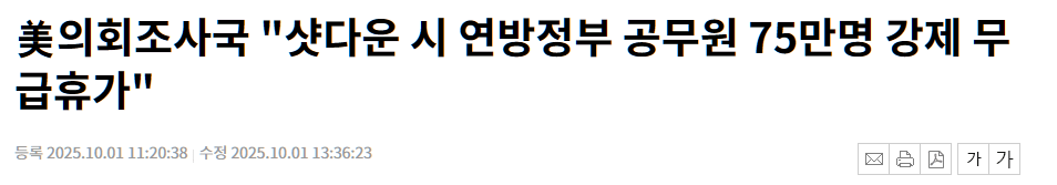 美의회조사국 "샷다운 시 연방정부 공무원 75만명 강제 무급휴가" :: 공감언론 뉴시스 ::