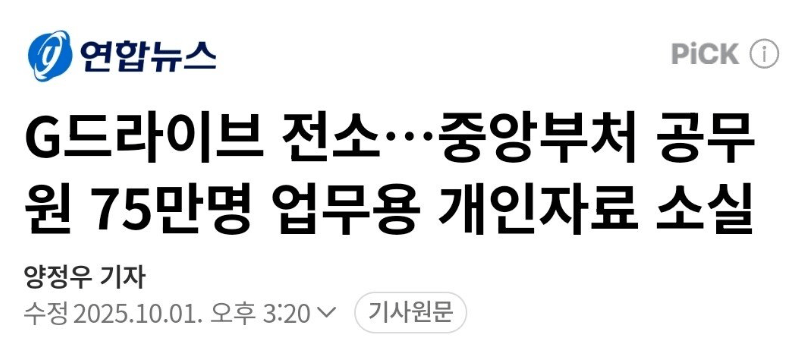 G드라이브 전소…중앙부처 공무원 75만명 업무용 개인자료 소실(종합) | 연합뉴스