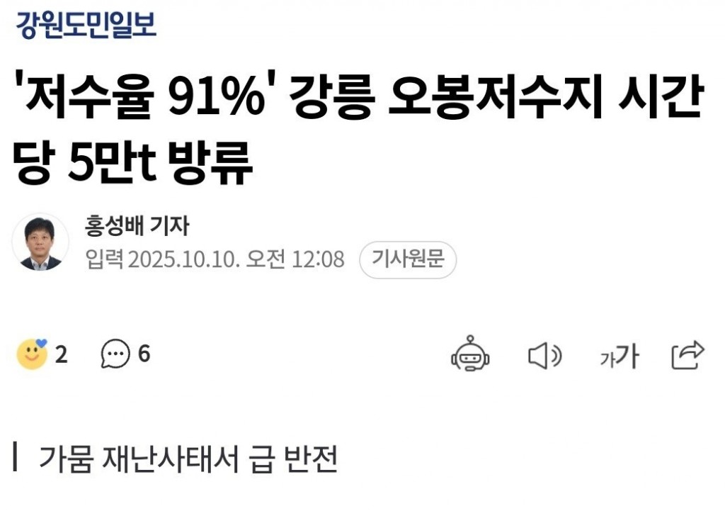 역대급 가뭄 때문에 급수제한까지했던 강릉 근황 댓글 0 조회 500 10.10 14:22 작성자 : 공룡 좋아요 팔로우 게시글 보기 ‘저수율 91%’ 강릉 오봉저수지 시간당 5만t 방류 < 강릉 < 지역 < 기사본문 - 강원도민일보 비가 너무많이와서 강릉 식수담당하는 오봉저수지 방류 결정함 저수율 91%인데 앞으로 비가 더온다함 공룡님의 최신 글 10.10 한국의 흔한 자리찜 아이템 10.10 잘때 휴대폰 하지말라는 디씨인 10.10 노벨평화상을 수상한 마리아 코리나 마차도는 누구인가? 10.10 오늘 총쏘고 테이저건쏘고 난리남 10.10 슈카코믹스 대황니니의 "한미반도체" 근황 10.10 궁지에 몰린 백종원 연돈볼카츠 근황 10.10 노벨 평화상 사전 유출 의심 정황 10.10 어플 사진 믿고 여자 만나러 감 10.10 사람들이 잘 모르는 궁수 등근육 ㄷㄷ 10.10 지역 축제에 과몰입 하는 아들