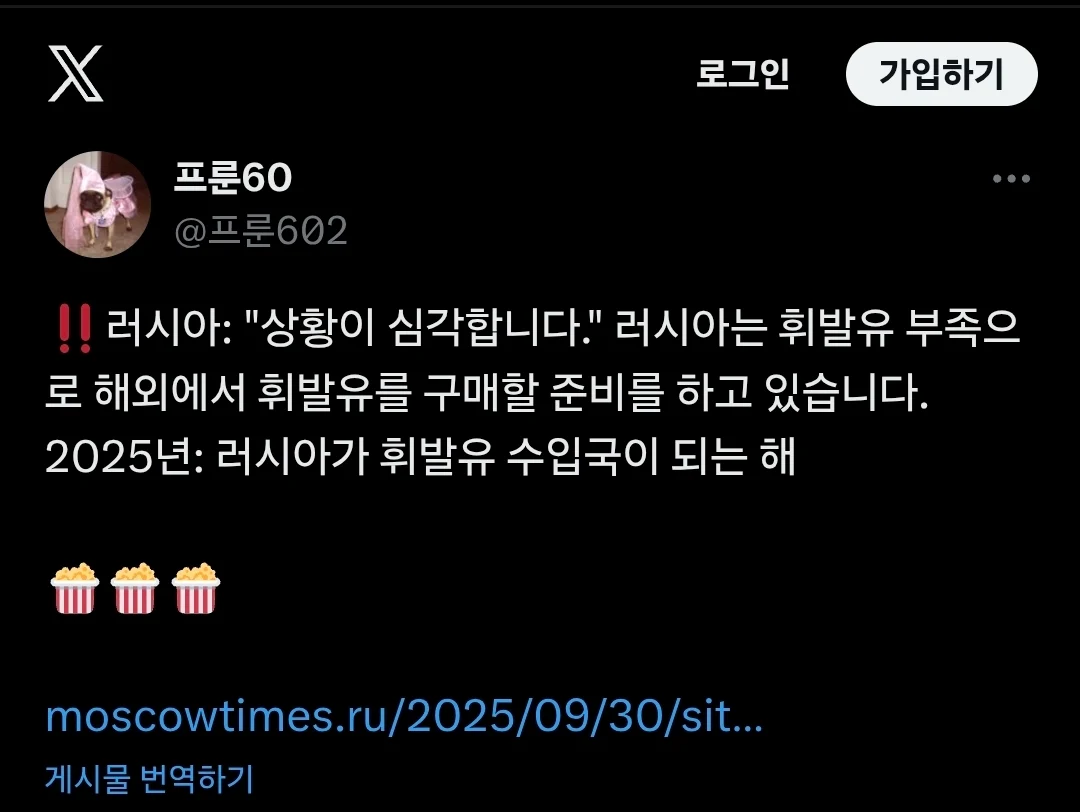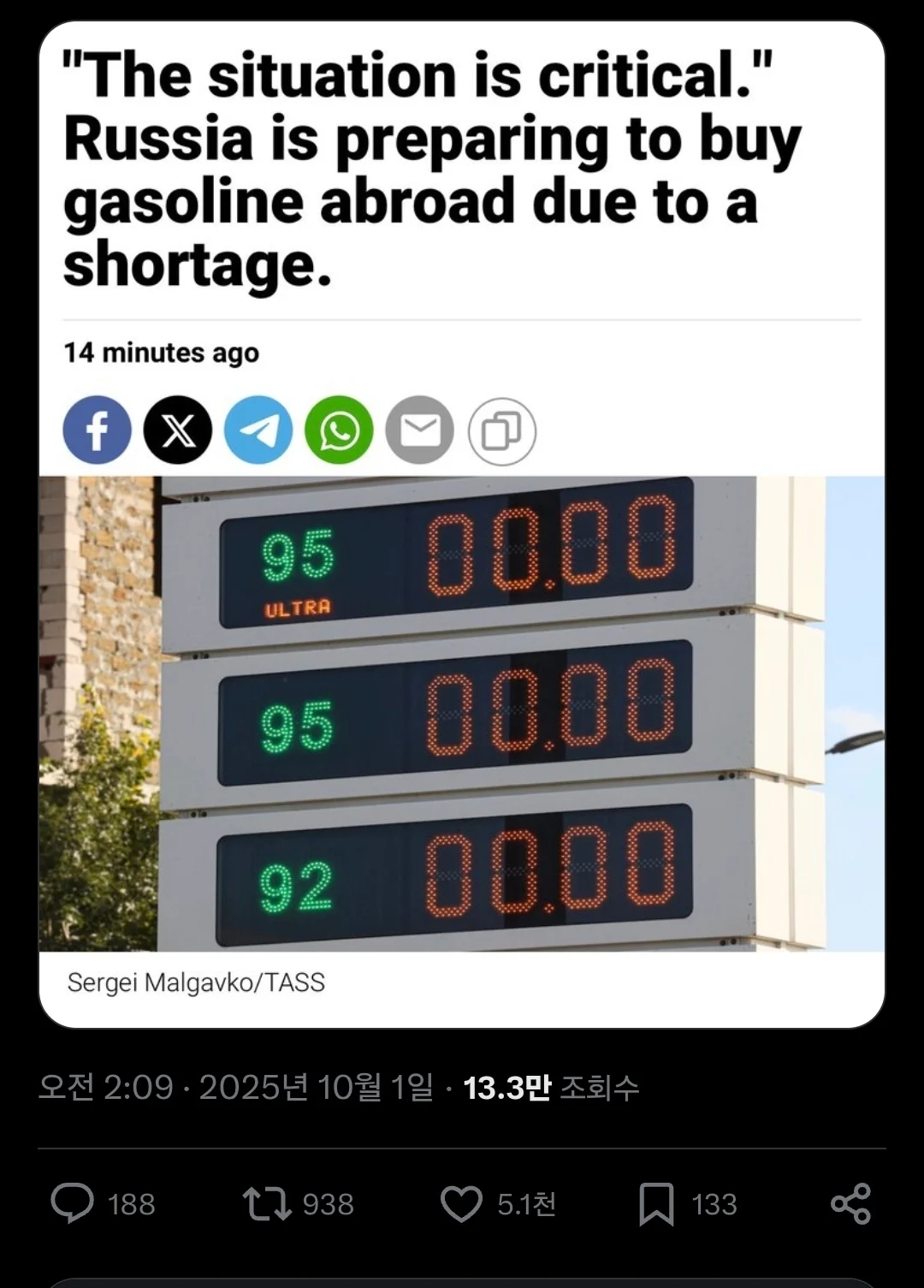 휘발유 부족으로 다른 국가에 휘발유 수입하는 러시아 댓글 0 조회 504 10.02 16:31 작성자 : 관셈보살 좋아요 팔로우 게시글 보기 우크라이나의 시설 공격으로 정유능력이 급감 러시아는 자원을 캘줄만 알지 그걸 가공하고 정제하는 기술이 없음. 전부 서유럽에 의존 산유국이 휘발유를 수입하는 사태가 발생 관셈보살님의 최신 글 10.03 성수 크래프톤 신사옥 최근 10.03 엄청난 가슴을 가진 직장 동료에게 솔직하게 고백해 봄 10.03 짐승도 거부하는 근친상간 10.03 벌초 하는데 부하 데려간 사람의 최후 10.03 사장한테 쎈척하고 알바 합격한 디시인 10.03 "의외의 승자", 소비쿠폰 사용처 1위 10.03 SKY 졸업했는데 취업이 힘들다는 학생 10.03 캄보디아 인신매매가 급증하게 된 진짜 이유 10.03 보배드림에 올라온 로또 1등 당첨된 사람 후기 10.03 한일 장거리 커플이 게임으로 노는 방법 ㅋㅋ