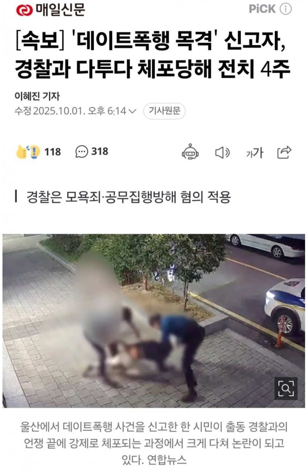 울산에서 한 여자가 남자친구를 때리는 모습을 보고