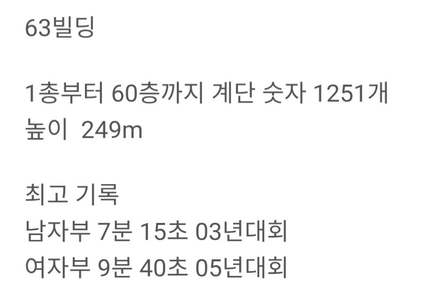 63빌딩 계단 오르기 대회 남녀 최고 기록 수준