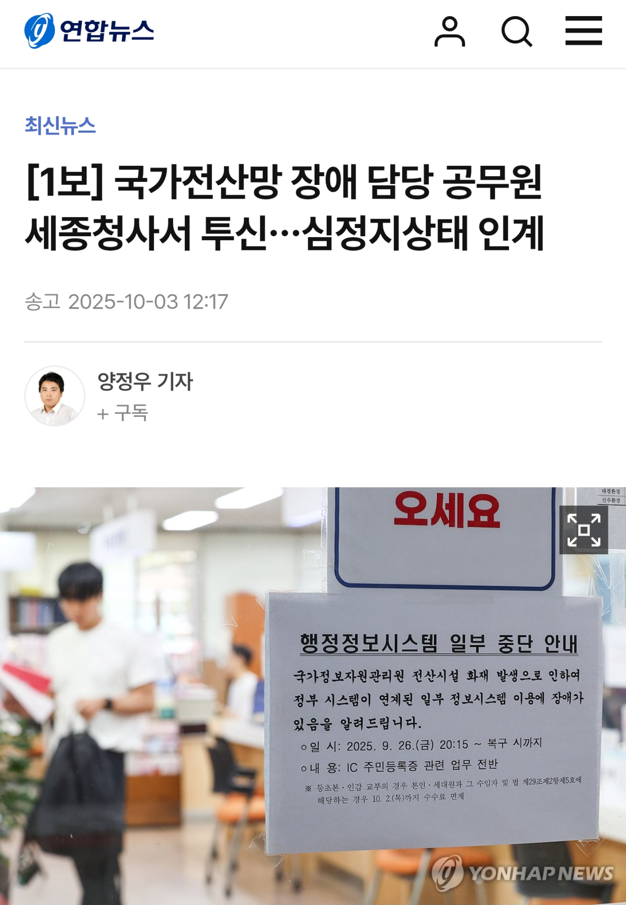 속보) 국가전산망 장애 담당 공무원 세종청사서 투신 사망 댓글 0 조회 563 4시간전 작성자 : 감정괴물 좋아요 팔로우 게시글 보기 [2보] 국가전산망 장애 담당 행안부 공무원 세종청사서 투신 사망 | 연합뉴스 감정괴물님의 최신 글 10.03 한국남자 -일본여자 커플의 궁합 10.03 존예로운 일본 레이싱걸 눈나 10.03 5살이 부르는 100명의 위인들 10.03 공무원들이 일하다가 인생 조지는 케이스 10.03 민생소비쿠폰 사용 안된다는 재래시장 매장 10.03 서양인 관광객이 평가한 한국 음식 10.03 어메이징.. 분당 집값 근황 10.03 한국에서 매출 1000억 이상 패션 브랜드 순위 10.03 부모가 자식에게 줄 수 있는 가장 위대한 유산 10.03 재미로 보는 역사적 인물들의 전투 승률 통계