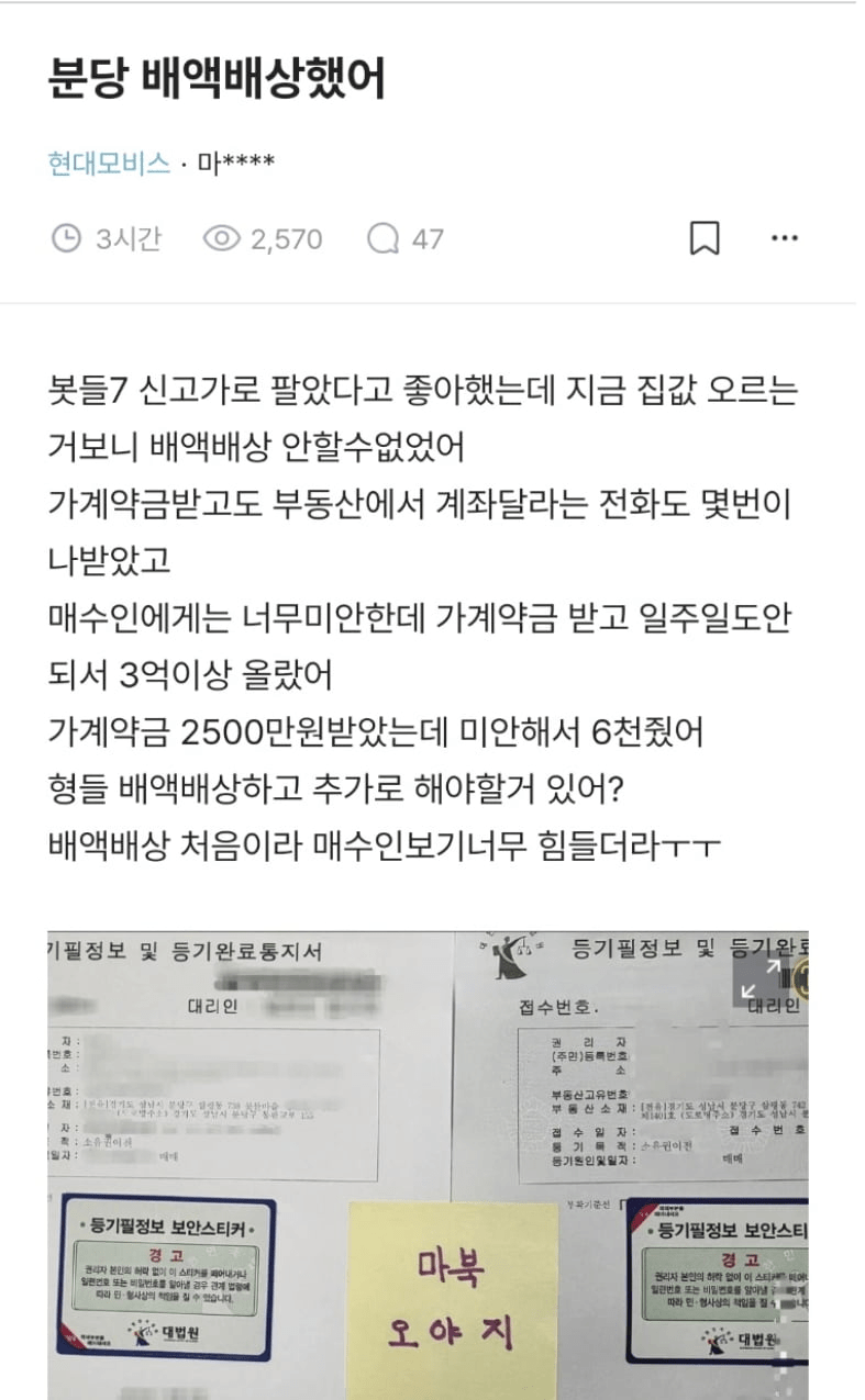 어메이징.. 분당 집값 근황 댓글 0 조회 576 4시간전 작성자 : 개장수11 좋아요 팔로우 게시글 보기 - 일주일만에 3억이 올라서 판매자가 계약취소 - 가계약금 2500만원 법적으로 두배 돌려줘야 하는데 미안해서 6천 줬음 - 매수인은 일주일만에 3500만원 공짜로 벌었지만 ㅈ같음 개장수11님의 최신 글 10.03 장기가 손상되는 원인 10.03 핀란드가 내향인의 천국인 이유 10.03 성과급이 1,700만원인 퐁퐁이햄 10.03 남자가 많은 나라와 여자가 많은 나라 10.03 국내기업 시총 순위 TOP 50 10.03 8급 공무원 남자의 한탄 10.03 30대에 인간관계가 정리되는 이유 10.03 의외로 전기로 할 수 있는데 안하는 것 10.03 해외에서 예전보다 탐욕스러워졌다고 까이는 게임사 10.03 요즘 영포티 아재룩 3대장