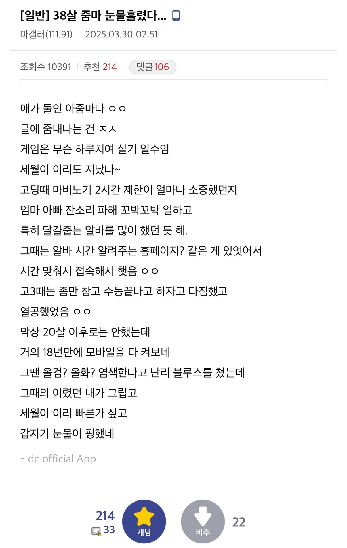 38살 아줌마 눈물 흘렸다.. 댓글 0 조회 564 5시간전 작성자 : 강승 좋아요 팔로우 게시글 보기 강승님의 최신 글 10.04 3만 5천원짜리 모듬전 실화냐? 10.04 프랑스인이 말하는 한국에 있었을때 놀라게 한 것들 10.04 추석 연휴 앞두고 집에서 쫓겨난 싱붕이 10.04 트럼프대통령 1달러 동전 발행 10.04 미국인 10명 중 9명, 한국산 제품에 대한 관세 인상 반대 10.04 헬스장에서 진짜 놀라운 것 10.04 드래곤볼 다시 보면 보이는 요소 10.04 명절에 조카가 내 건담을 도색함 10.04 김앤장도 변호 포기한 사건 10.04 스테로이드 투약을 시도한 서양인의 결말