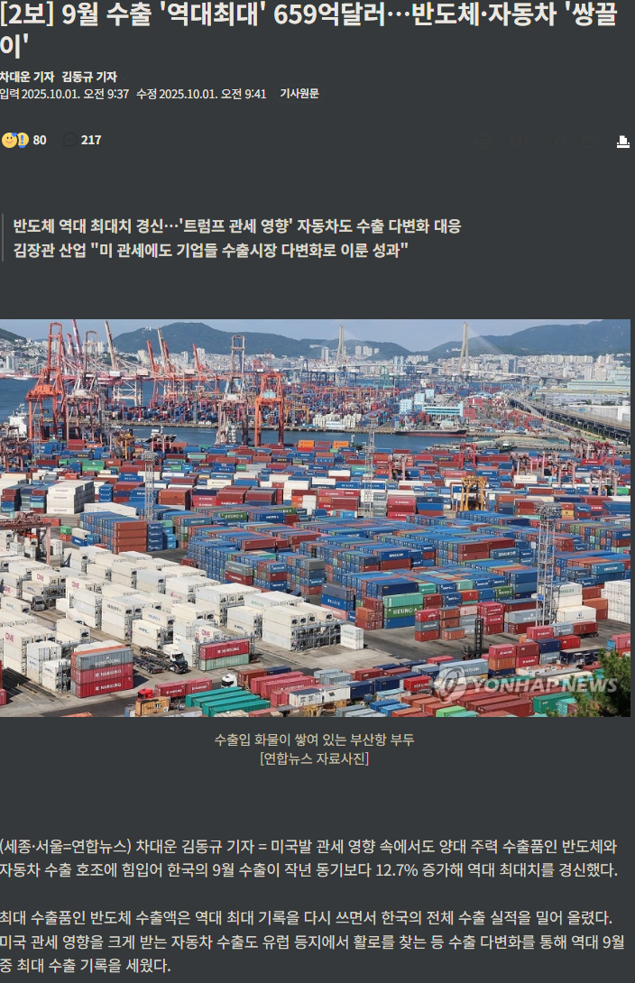 - 10.04 미국 관세에도 2025.9.월 수출 659억달러 역대 최대 기록