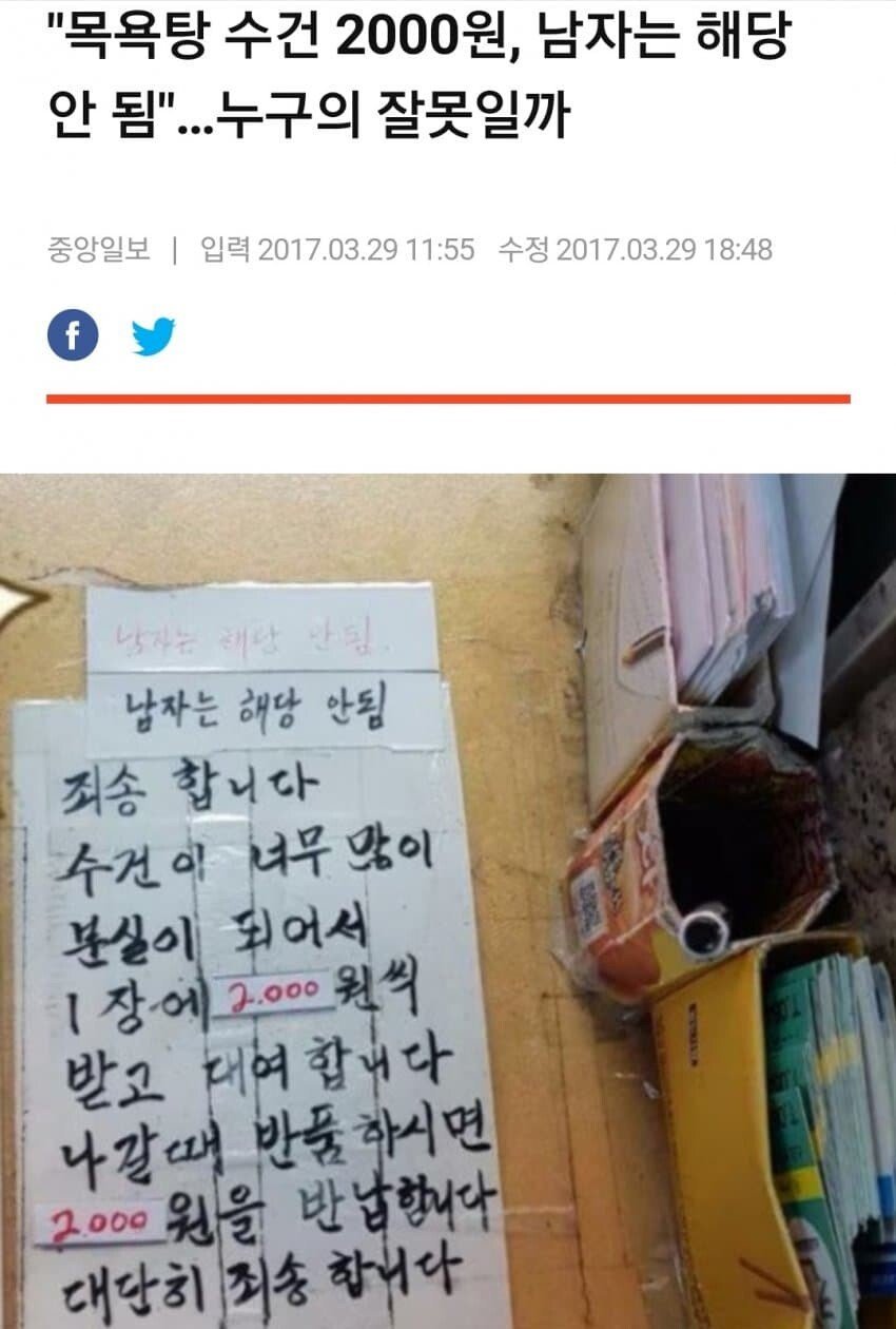왜 여자만 목욕탕 수건을 돈 받을까? 댓글 0 조회 512 9시간전 작성자 : 대박노 좋아요 팔로우 게시글 보기 "목욕탕 수건 2000원, 남자는 해당 안 됨"…누구의 잘못일까 | 중앙일보 대박노님의 최신 글 10.10 세종대 레전드 누나 10.10 미성년자에게 성 착취물 요구, 받아낸 경찰관 등 9명 송치 10.10 인력거 사고 승객 시점 체감 10.10 여친이 욕을 너무 심하게해서 고민인 쿠팡남 10.10 요즘 고등학생 커플 근황 10.10 오늘자 게임 갤러리 현피 신청 근황 10.10 캄보디아 카지노에서 대규모 탈출하는 베트남인들 10.10 주식 팔면 다음 날 돈 받는다…결제 주기 단축 "시동" 10.10 유일한 친구에게 카톡으로 손절 당한 사람 10.10 당근마켓 주술회전 빌런