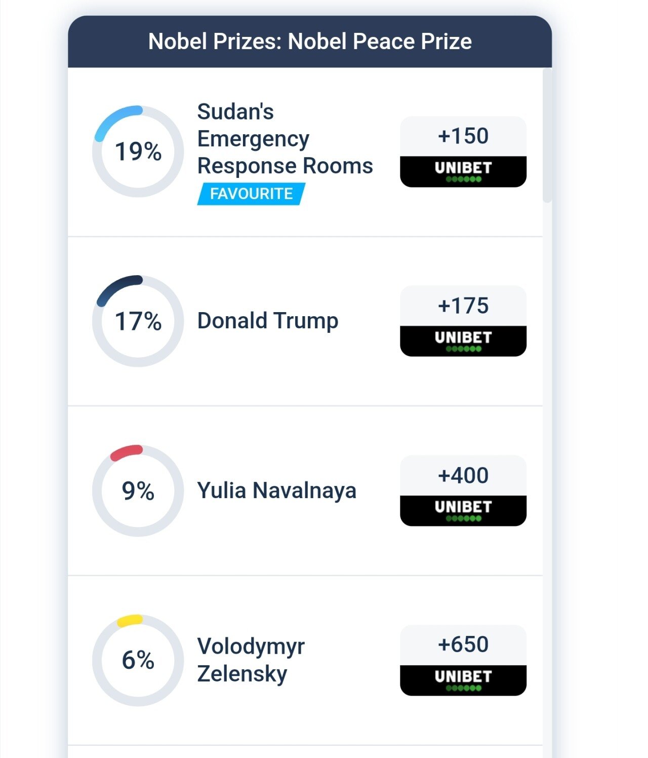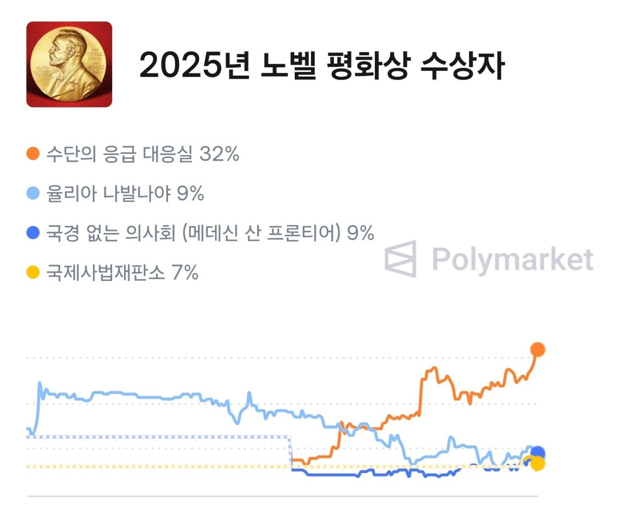 오늘 발표될 노벨평화상 베팅 확률 댓글 0 조회 501 9시간전 작성자 : 관셈보살 좋아요 팔로우 게시글 보기 트럼프 확률 폴리마켓: 5%(5위) 스타스포츠: 25%(2위) 유니벳: 17%(2위) 주요 베팅사이트 후보들로는 '수단 긴급 대응실(SERR)' 러시아 반정부인사 고 '알렉세이 나발니' 의 아내 국제 사법재판소 국경없는 의사회 도널드 트럼프 등 *노벨평화상은 오늘저녁 6시 발표(한국시간) 관셈보살님의 최신 글 10.10 세종대 레전드 누나 10.10 미성년자에게 성 착취물 요구, 받아낸 경찰관 등 9명 송치 10.10 인력거 사고 승객 시점 체감 10.10 여친이 욕을 너무 심하게해서 고민인 쿠팡남 10.10 요즘 고등학생 커플 근황 10.10 오늘자 게임 갤러리 현피 신청 근황 10.10 캄보디아 카지노에서 대규모 탈출하는 베트남인들 10.10 주식 팔면 다음 날 돈 받는다…결제 주기 단축 "시동" 10.10 유일한 친구에게 카톡으로 손절 당한 사람 10.10 당근마켓 주술회전 빌런