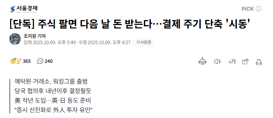 주식 팔면 다음 날 돈 받는다…결제 주기 단축 "시동" 댓글 0 조회 561 10.10 18:44 작성자 : 공룡 좋아요 팔로우 게시글 보기 https://n.news.naver.com/article/011/0004541565 공룡님의 최신 글 10.10 한국의 흔한 자리찜 아이템 10.10 잘때 휴대폰 하지말라는 디씨인 10.10 노벨평화상을 수상한 마리아 코리나 마차도는 누구인가? 10.10 오늘 총쏘고 테이저건쏘고 난리남 10.10 슈카코믹스 대황니니의 "한미반도체" 근황 10.10 궁지에 몰린 백종원 연돈볼카츠 근황 10.10 노벨 평화상 사전 유출 의심 정황 10.10 어플 사진 믿고 여자 만나러 감 10.10 사람들이 잘 모르는 궁수 등근육 ㄷㄷ 10.10 지역 축제에 과몰입 하는 아들