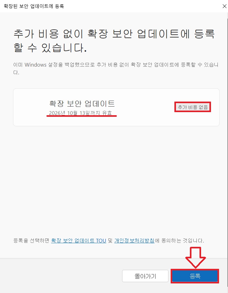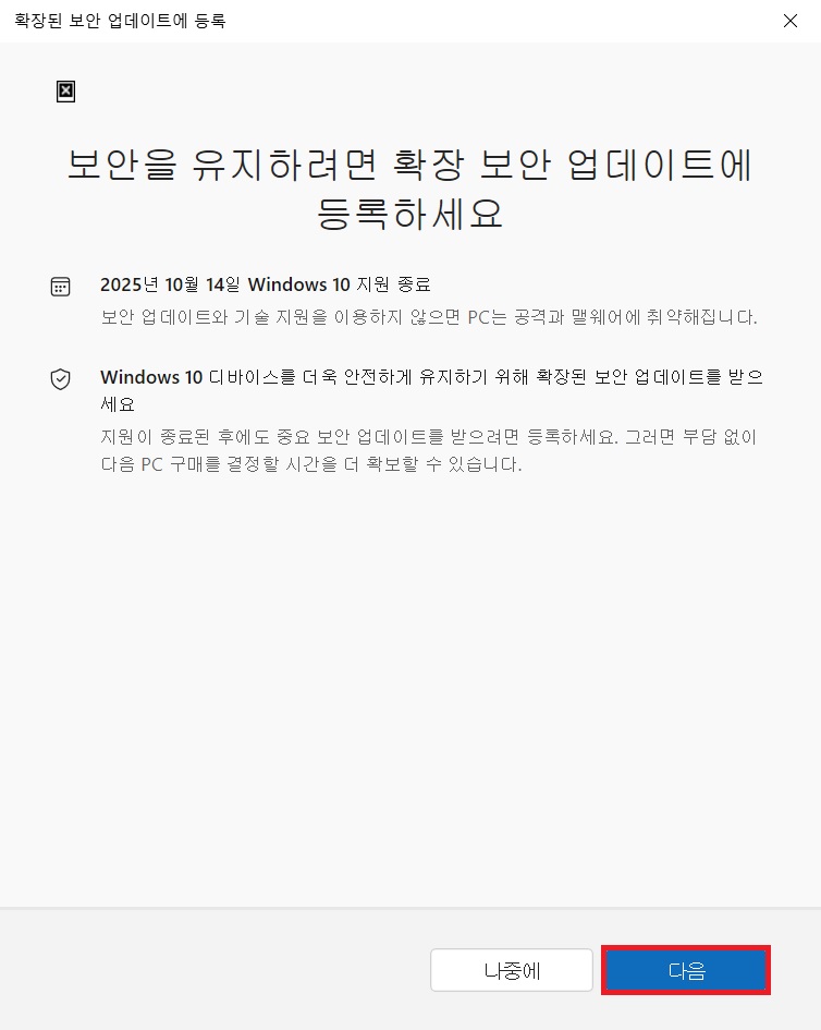 그러면 종료된다는 문구와 함께 확장 보안 업데이트에 등록하라는 글이있는데 여기서 지금 등록을 클릭