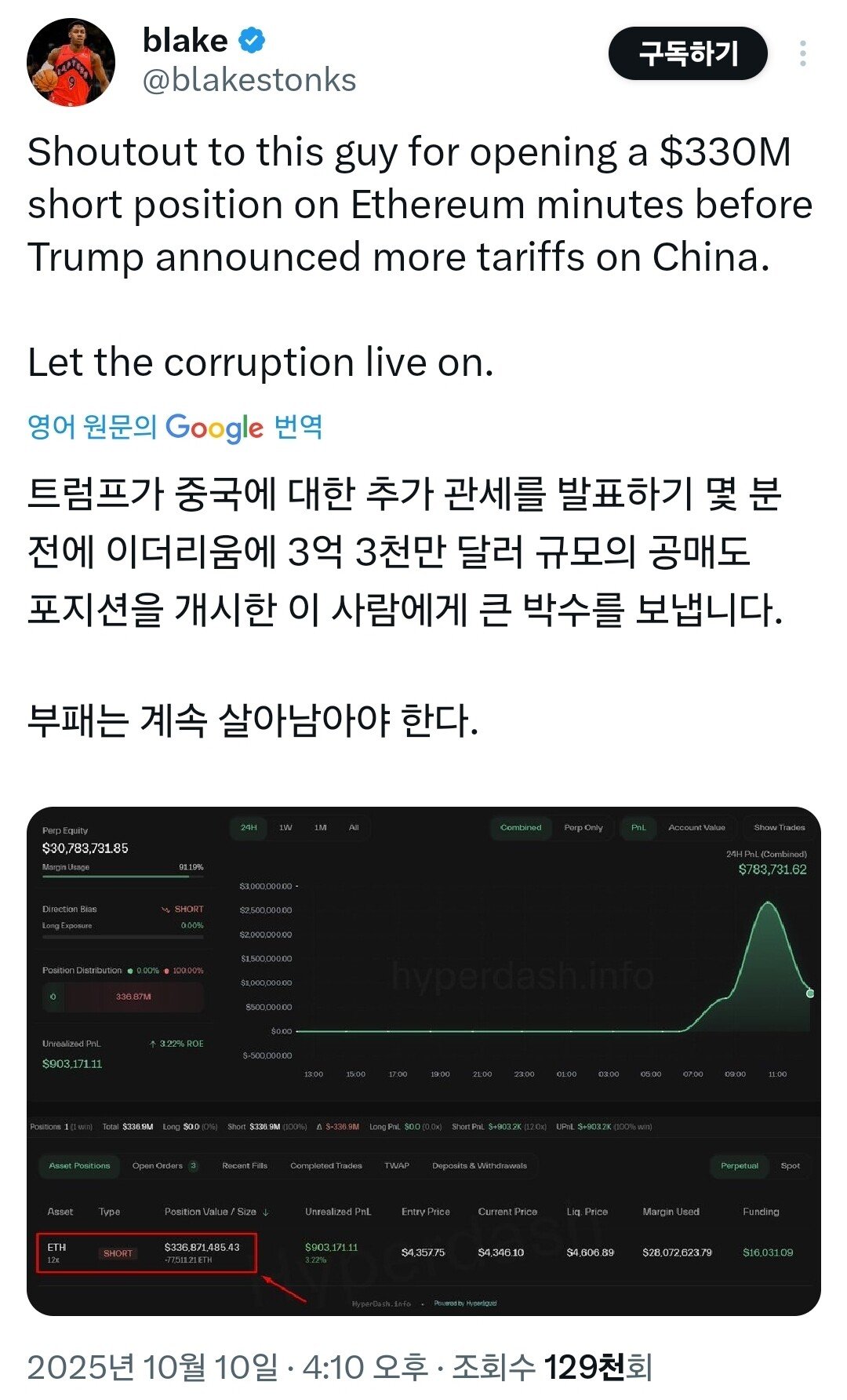 트럼프 발표 전 나온 의심스러운 거액의 공매도 댓글 0 조회 515 5시간전 작성자 : 더한마음 좋아요 팔로우 게시글 보기 진짜 존나 해쳐먹는구나 그것도 몇천억단위로 주식으로 하면 걸릴수도 있으니 코인으로 하는듯 악재발표할거 알고있으면 무조건 먹음 ㅋㅋ 버핏이고 나발이고 더한마음님의 최신 글 10.11 젊은 존잘남이 고프다는 병원 여성 10.11 벨기에 소 근육 상태 10.11 미국 테네시, 탄약 공장 폭발로 19명 실종 현장 영상 10.11 쿠팡 오배송을 받게 된 사람 10.11 어느동네 카페 여사장님 10.11 한강에서 런닝하는 황새 10.11 역사 지식이 있으면 즐길 수 있는 그림 감상 10.11 납치 한국인 구조요청에 캄보디아 대사관 대응 10.11 대학교에서 노숙자를 신고했더니 벌어진 일 10.11 (욕주의) 거래처 전화받다 본심이 나와버린 운전자