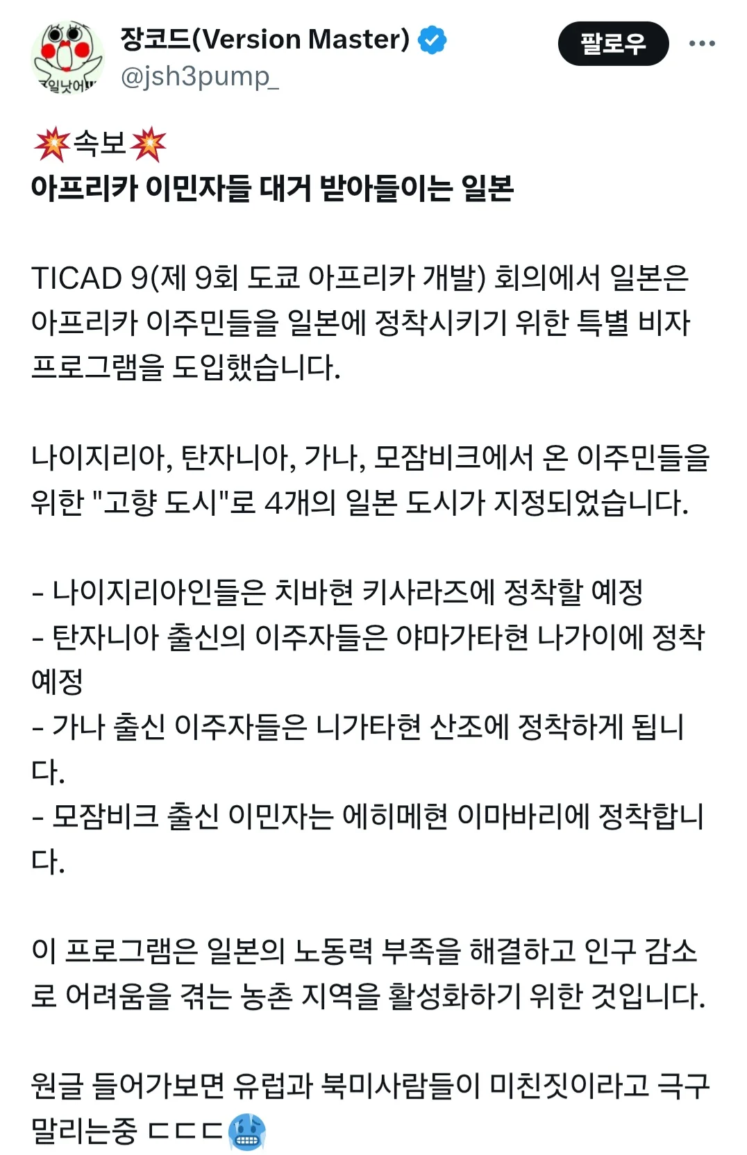 아프리카 이민자 받는다는 일본 댓글 0 조회 549 3시간전 작성자 : 드가쥬아 좋아요 팔로우 게시글 보기 기존 일본 외노자들이 한국 베트남 중국인이 대부분이었다면 일본 정부가 이제는 아프리카로도 인구 감소를 메꾸기 위해 눈을 돌리고 있음 드가쥬아님의 최신 글 10.12 미국 맥도날드에서 인종차별 당한 한국인 근황 10.12 교사 여자친구의 결혼조건 10.12 30대 여직원 지능 논란 10.12 온리팬스 모델겸 페미니스트를 말로 패는 촉법소년 10.12 남자 성형에 대한 2030 여성들의 반응 10.12 요즘 대단지 아파트들이 갈수록 외부인 틀어막는 이유 10.12 친구니 이해한다 VS 뿜빠이는 아니다 10.12 콘돔 사면서 편순이 성희롱하는 영포티 10.12 성경에 공룡이 없는 이유 10.12 어느 강아지의 봄 여름 가을 겨울