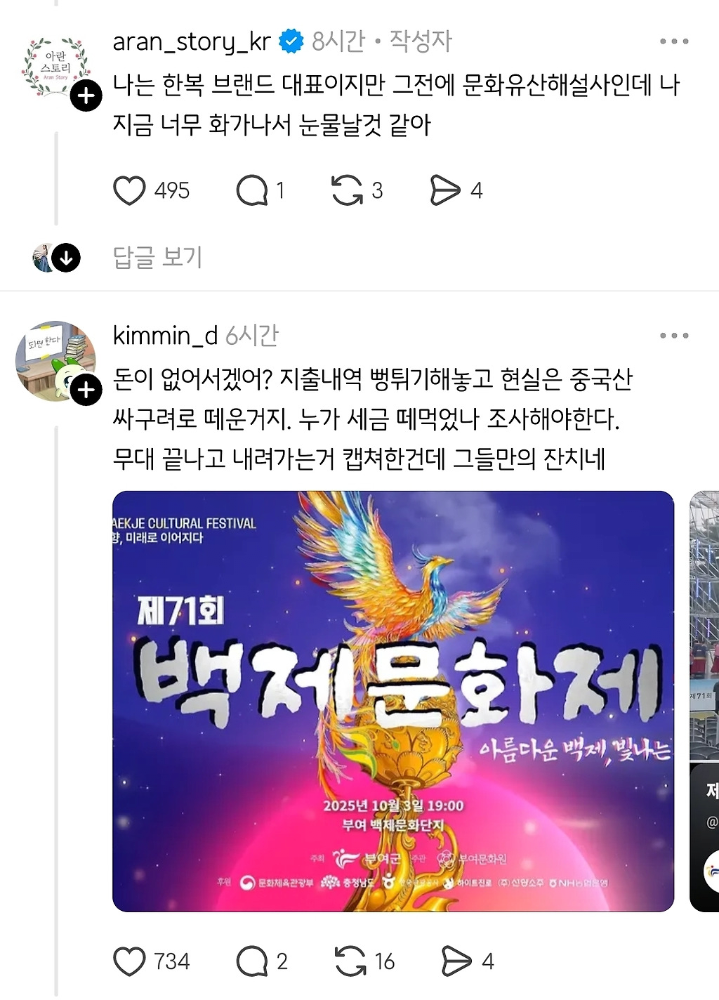 논란되고 있는 부여 지역축제 댓글 0 조회 534 4시간전 작성자 : 돌잔치앤가반나 좋아요 팔로우 게시글 보기 중국쇼핑몰에서 싸게 파는 코스프레 의상으로 백제 복식 패션쇼 진행… 돌잔치앤가반나님의 최신 글 10.12 카페가 너무 더러워서 사장님에게 말한 바리스타 10.12 2026년 군인 월급 근황 10.12 이탈리아 사람들 심정 이해하기 10.12 암컷말과 관계를 맺었다고 주장하는 어느 디시인 10.12 의외로 커뮤니티에서 걸러야 하는 문구 10.12 싱글벙글 일본 메이플스토리 근황 10.12 대한민국 현재 상황 10.12 시골 하천에 축구공이 빠진 일본인들 10.12 한식 원탑 정상결전 10.12 다정함은 지능이다 vs 체력이다