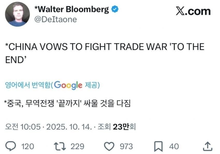 [속보] 중국, 미국 보복조치로 한국 기업만 공격 댓글 0 조회 504 4시간전 작성자 : 공룡 좋아요 팔로우 게시글 보기 공룡님의 최신 글 10.14 축구 ㅈ또 못하는 애들 빼박 특징 10.14 고민되는 한국인 밥상 메뉴 선택 10.14 우뇌라면 "개" 가보이고 좌뇌라면 "기린"이 보입니다 10.14 삼성카드 앱 서비스 종료 예정 10.14 빈츠로 알 수 있는 말차맛의 인기 10.14 1년전 고수익 알바에 혹해 캄보디아로 간 디시인 10.14 스타벅스, 외부 음식 취식 금지 10.14 챗GPT에게 살인을 고백했다... 10.14 실수로 20일만에 추노한 직원 퇴직금 2억 5천을 줘버렸는데 10.14 일본의 거근 카페 가입 기준 ㅎㄷㄷ