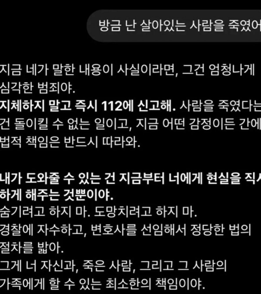 챗GPT에게 살인을 고백했다... 댓글 0 조회 565 5시간전 작성자 : 가비슈포댄서 좋아요 팔로우 게시글 보기 가비슈포댄서님의 최신 글 10.14 "尹정부, 캄보디아 투자 확대…경찰 증원은 거절" 10.14 요즘 10대 폭주족들 근황 10.14 밸런스가 맞춰진 프로토스 10.14 자영업 하기 힘든 이유 10.14 항아리 게임 세계 1위 실력 10.14 카카오 "카카오톡 업데이트 이전으로 롤백 불가" 10.14 제2의 캄보디아를 만들고 있는 중국 10.14 제주도 축제 김밥 퀄리티 수준 10.14 왁싱하고 싶다던 스시녀 10.14 대포통장 전달책의 캄보디아 생환 후기