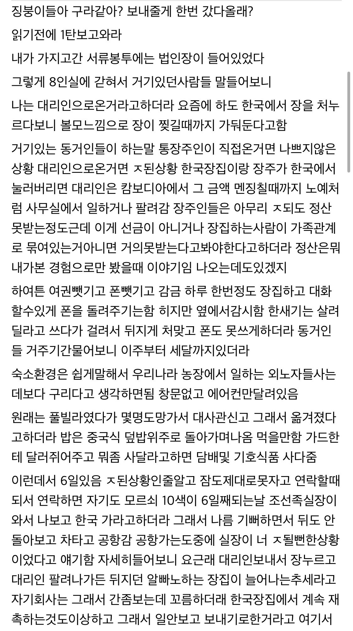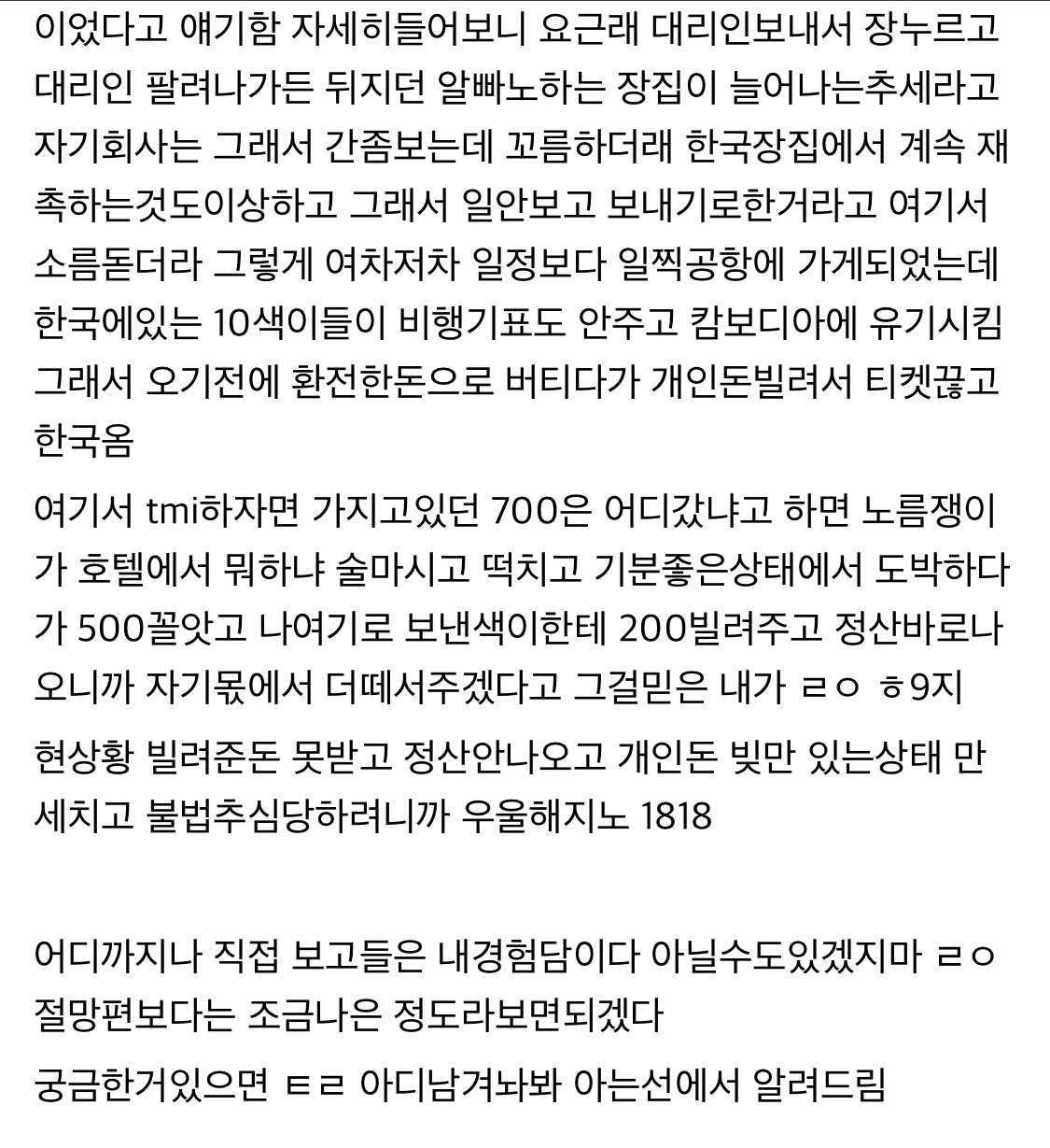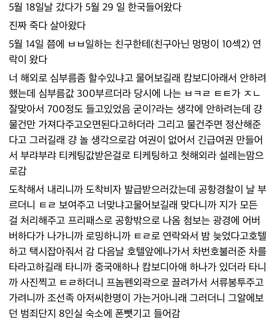 대포통장 전달책의 캄보디아 생환 후기 댓글 0 조회 558 10.14 20:24 작성자 : 관셈보살 좋아요 팔로우 게시글 보기 장집 = 대포통장 판매책 누른다 = 먹튀 통장찢김 = 거래정지 세줄요약 1. 친구가 심부름 한번 해달라고 해서 갔는데 알고보니 대포통장 전달책 2. 캄보디아에서는 한국 장집한테 먹튀당할까봐 대리인 (=볼모) 통해서 받은 거임 3. 근데 느낌이 먹튀할 느낌이라 캄보디아에서도 거르고 보내줌 친구 팔아서 캄보디아 돈 먹튀하려고 했는데 실패한거 ㄷㄷㄷ 관셈보살님의 최신 글 10.14 위쳐4 트레일러 재현한 누나 10.14 도박 중독자의 캄보디아 합숙 후기 10.14 인도 동네축구에서 나온 원더골 10.14 수십년간 해결하지 못했던 천문학자들의 미스터리 10.14 국립중앙도서관 80주년 특별전 & T1 기획전시 10.14 내 기준 절대 용서할수 없는 라면은? 10.14 임산부인데 남편이 베개로 때림 10.14 일부다처제의 개꿀인 점 10.14 대전 아파트 단지 근황 10.14 금 한돈 시세 근황