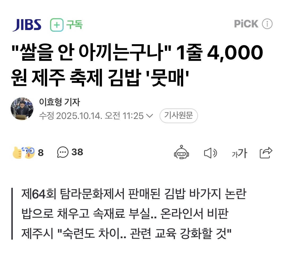 제주도 축제 김밥 퀄리티 수준 댓글 0 조회 577 10.14 20:23 작성자 : 더한마음 좋아요 팔로우 게시글 보기 https://n.news.naver.com/mnews/article/661/0000063400?sid=001 저 퀄리티에 1줄 4천원 ㄷㄷ 더한마음님의 최신 글 10.14 위쳐4 트레일러 재현한 누나 10.14 도박 중독자의 캄보디아 합숙 후기 10.14 인도 동네축구에서 나온 원더골 10.14 수십년간 해결하지 못했던 천문학자들의 미스터리 10.14 국립중앙도서관 80주년 특별전 & T1 기획전시 10.14 내 기준 절대 용서할수 없는 라면은? 10.14 임산부인데 남편이 베개로 때림 10.14 일부다처제의 개꿀인 점 10.14 대전 아파트 단지 근황 10.14 금 한돈 시세 근황