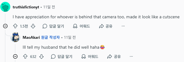 위쳐4 트레일러 재현한 누나 댓글 0 조회 589 10.14 21:03 작성자 : 가비슈포댄서 좋아요 팔로우 게시글 보기 저 카메라 뒤에 있는 사람에게 감사함. 컷신처럼 보이게 만들었네. 내가 남편한테 잘했다고 전해줄게 ㅋㅋ 가비슈포댄서님의 최신 글 10.14 2찍 댓글부대 배후가 캄보디아 10.15 권은비, 일본 공연 꼭노 영상 10.14 위쳐4 트레일러 재현한 누나 10.14 도박 중독자의 캄보디아 합숙 후기 10.14 인도 동네축구에서 나온 원더골 10.14 수십년간 해결하지 못했던 천문학자들의 미스터리 10.14 국립중앙도서관 80주년 특별전 & T1 기획전시 10.14 내 기준 절대 용서할수 없는 라면은? 10.14 임산부인데 남편이 베개로 때림 10.14 일부다처제의 개꿀인 점