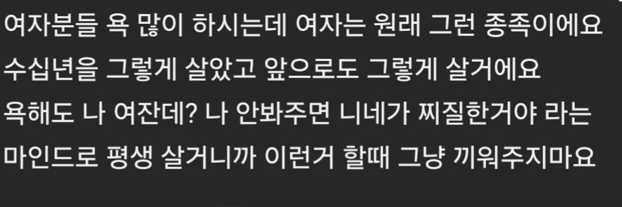 "여자는 원래 그런 종족입니다 그냥 끼워주지 마세요" 댓글 0 조회 565 4시간전 작성자 : 네이마르로 좋아요 팔로우 게시글 보기 정확히 한손으로 하는 룰 "나 여잔데? 나 안 봐주면 니네가 찌질한거야" 심리 파악 ㅋㅋㅋ 네이마르로님의 최신 글 10.15 코스피, 사상 최고치 경신…시가총액 3000조 첫 돌파 10.15 트위터에서 난리난 미국 가족 10.15 낭만 있는 게임회사의 팬서비스 10.15 잠깐 주차했다가 64000원 나온 사람 10.15 캄보디아 관련 베트남 반응 10.15 "여자는 원래 그런 종족입니다 그냥 끼워주지 마세요" 10.15 캄보디아보다 심했던 엘살바도르근황 10.15 일하다 갑자기 서러움터진 배달기사 10.15 방학 업무도 빡세다는 교사를 본 디시인 10.15 명량대첩은 운이 좋아서 이긴 거라는 사람