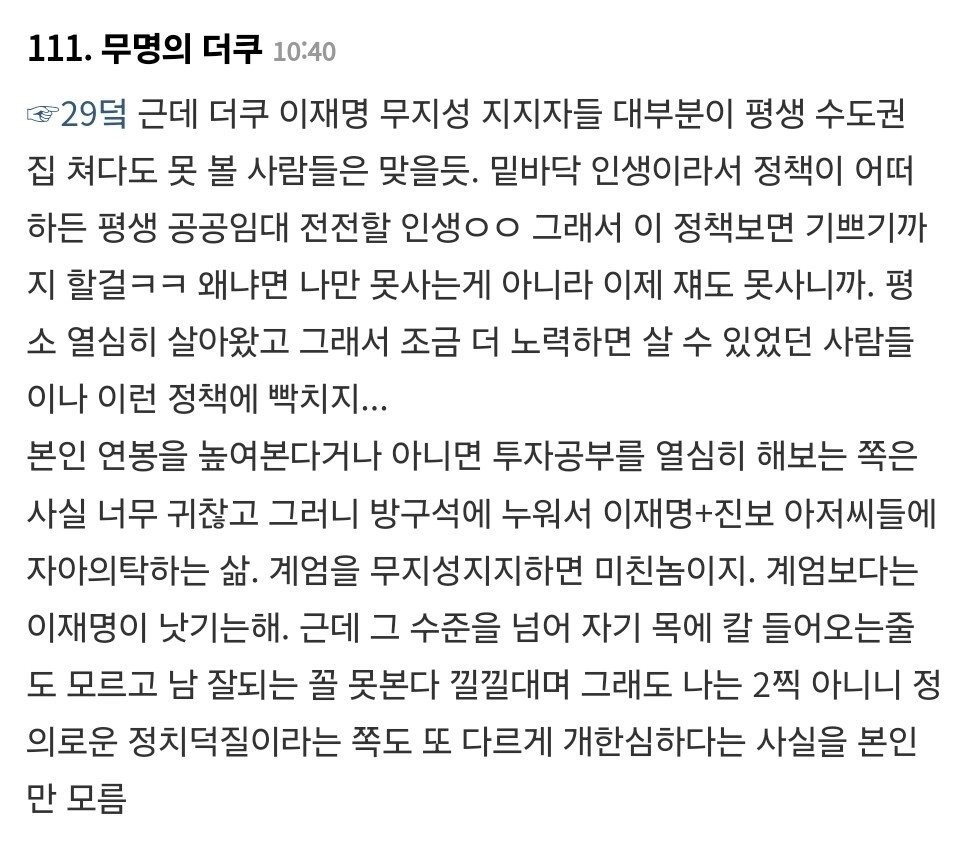여초 커뮤에서 이번 부동산 정책에 대한 반응 댓글 0 조회 540 10.15 19:40 작성자 : 네이마르로 좋아요 팔로우 게시글 보기 나만 못사는게 아니라 쟤도 못사는 나라 애초에 부자들은 나라를 떠난다 초고령화, 초저출산 국가에서 쿠폰 뿌리고 세수까지 줄어드는 경제의 말로는? 정치충들은 또 1찍 2찍 거리기만 한다. 네이마르로님의 최신 글 10.16 치마를 입으면 더욱 아찔해 지는 계단 10.16 중국인 관광객 조건부 한국내 운전 허용 검토 10.16 진주남강유등축제 닭강정 1만원 어치 10.16 싱글벙글 애플 직원할인 받기 10.16 승률 100% 트럼프 내부자 계좌 근황 10.16 갓 오브 워 팬들끼리 은근히 갈리는 주제 10.16 시간 정지 능력의 패널티 수준 10.16 초코 케이크로 만드는 미국식 초코쉐이크 10.16 회사에서 ㅈ될 뻔한 블붕이 10.16 남자에게 40대가 된 다는 것은