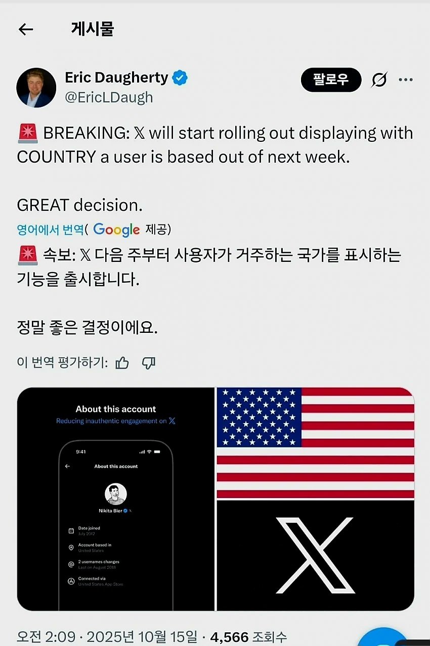 X(구: 트위터) 다음주부터 국적표시 의무화 댓글 0 조회 575 7시간전 작성자 : 개장수11 좋아요 팔로우 게시글 보기 우리나라 네이버야말로 국적표시 도입이 필수일듯 하네요... 개장수11님의 최신 글 10.16 여사친과 레즈바를 가본 썰 10.16 싱글벙글 난리난 씹덕겜 콜라보 제품 10.16 산속 폐허에서 발견된 물건 10.16 딸내미의 장난에 눈앞이 깜깜해짐 10.16 깨끗이 정리한 일본 우동집 10.16 폐관수련하면 안되는 이유 10.16 한국 치안이 좋은 이유를 단번에 설명해주는 글 10.16 학교 열쇠 레전드 10.16 스마트폰 발명 후 최악의 기술 10.16 오늘 서비스 종료 했다는 넥슨 게임