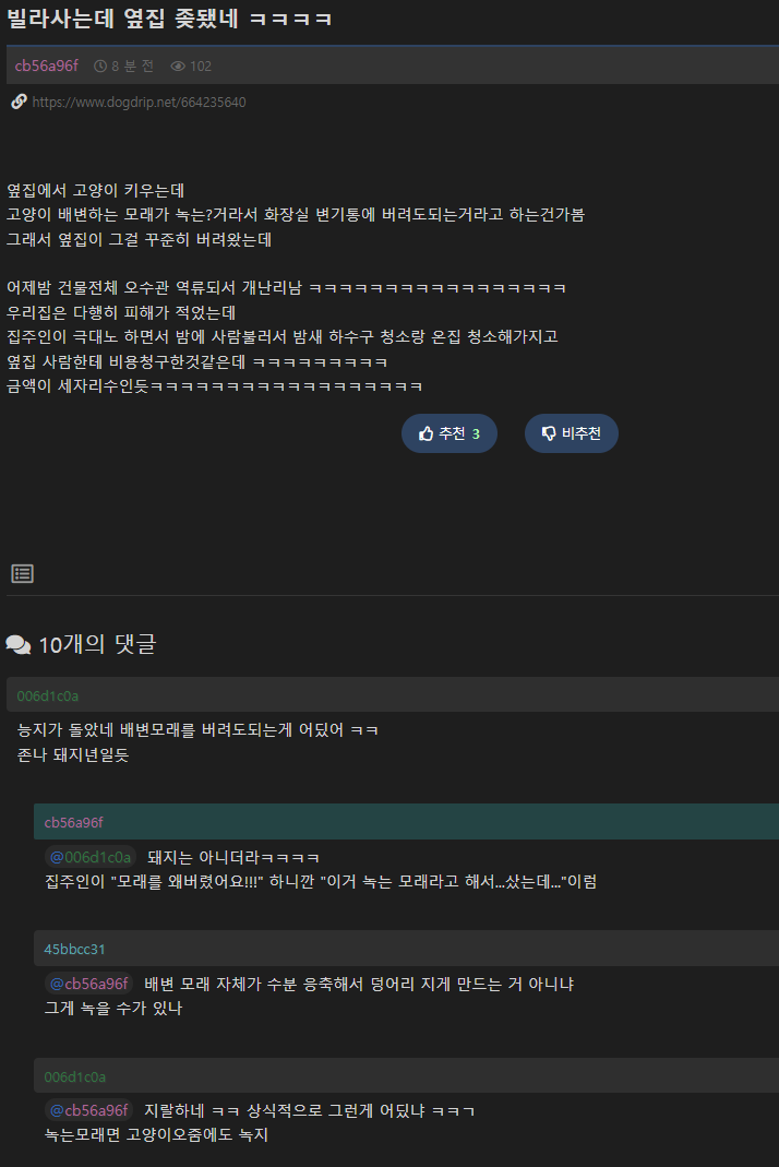빌라 사는데 옆집 ㅈ됐다는 사람 댓글 0 조회 511 6시간전 작성자 : 가지마라 좋아요 팔로우 게시글 보기 가지마라님의 최신 글 10.16 홈캠에 찍힌 아빠와 딸 10.16 혐주의) 레딧서 핫한 할로윈 장식 10.16 생각보다 야한 악어 입 속.mp4 10.16 시원한 독일의 배수구 청소 10.16 한국에서 연애 시작하는 방법을 본 외국인 10.16 캄보디아 총리 "한국인 사망 유감.. 용의자 체포 노력" 10.16 (분노) 샐러디 신메뉴 치아바타 사진과 비교 10.16 오늘자 레이 박아버린 버스 ㄷㄷ 10.16 통일되면 군대 정말 안갈까? 10.16 서울에 여행온 일본인들이 조식먹으러 자주 간다는 식당